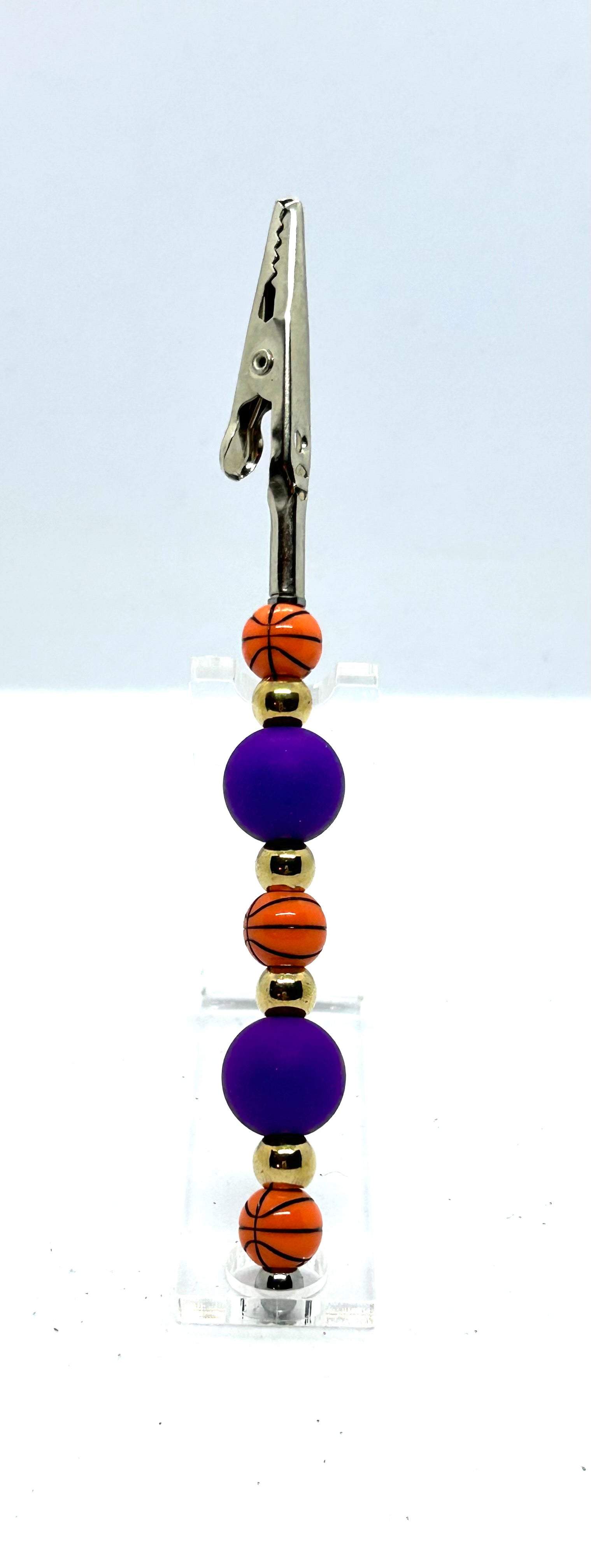 The Basketball 420 Solution features a gold metal roach clip adorned with purple and gold beads, as well as acrylic basketball beads. This statement accessory is perfect for basketball fans and adds a touch of style to any outfit. Securely hold your joint while showing off your love for the game.