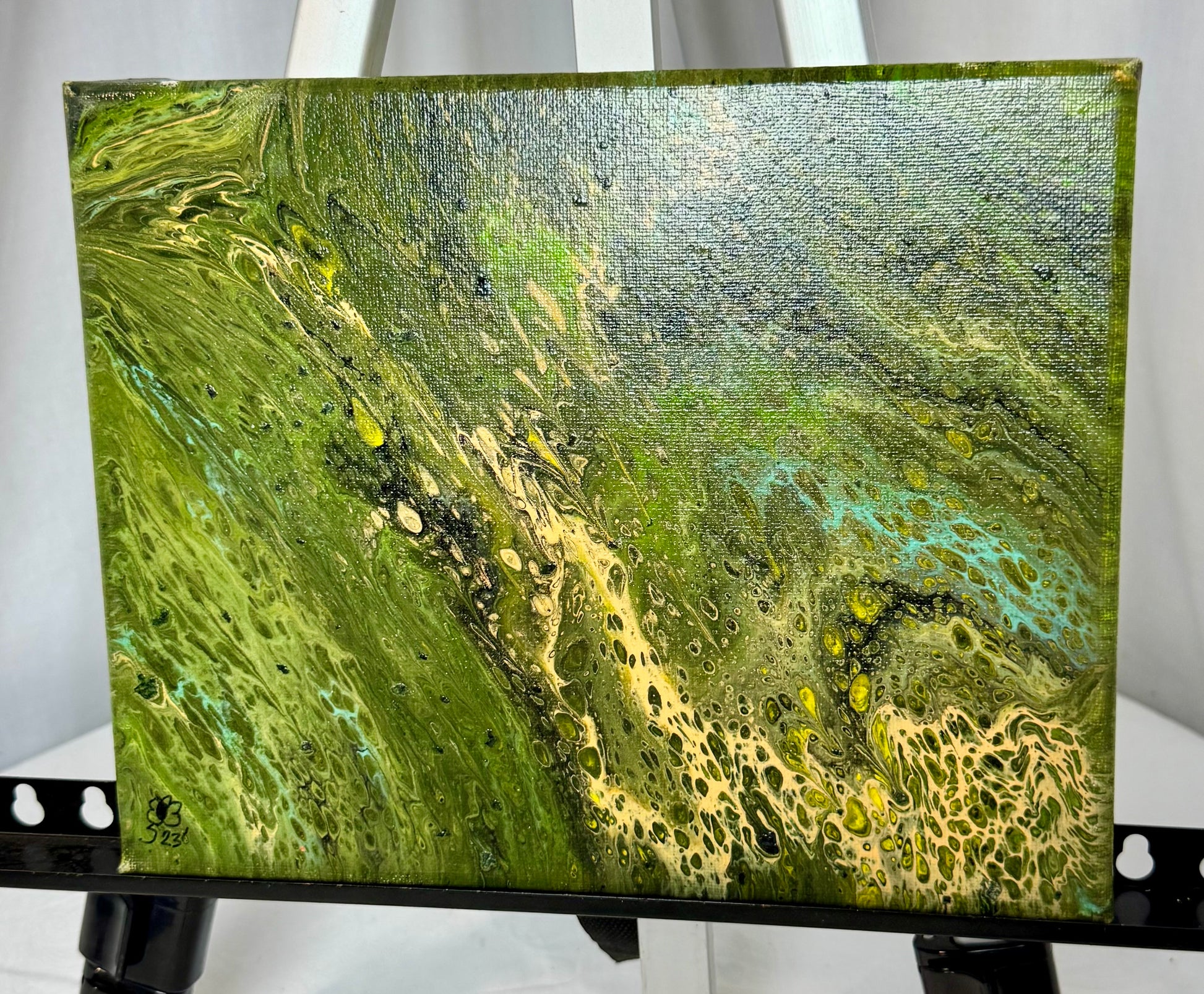 "Experience the vibrant colors and unique patterns of our Cell 1st Form! This 8x10" paint pour painting features a blend of orange and green, creating a one-of-a-kind piece that will add a pop of color to any room. Elevate your home decor with this eye-catching and dynamic art piece!"