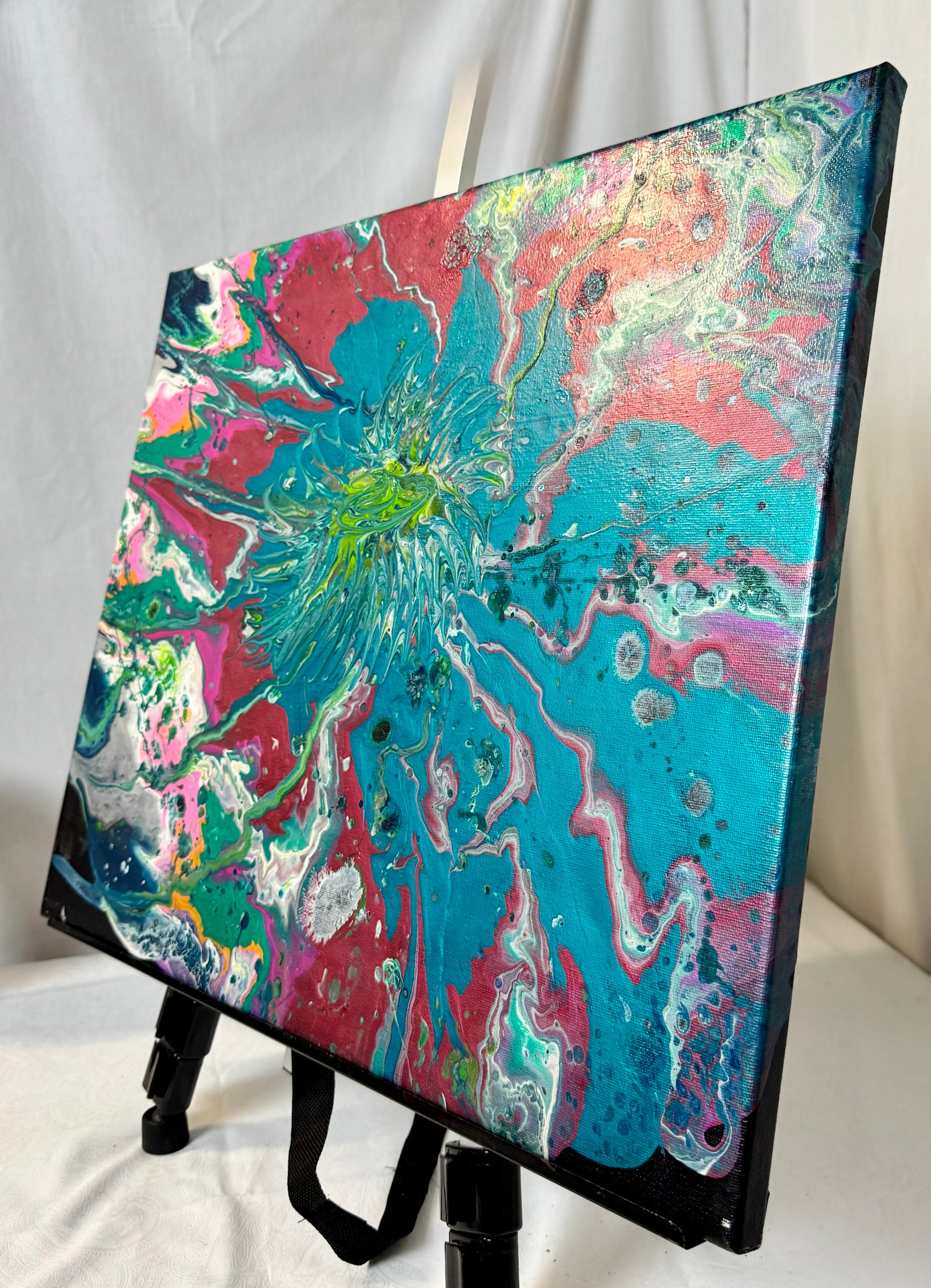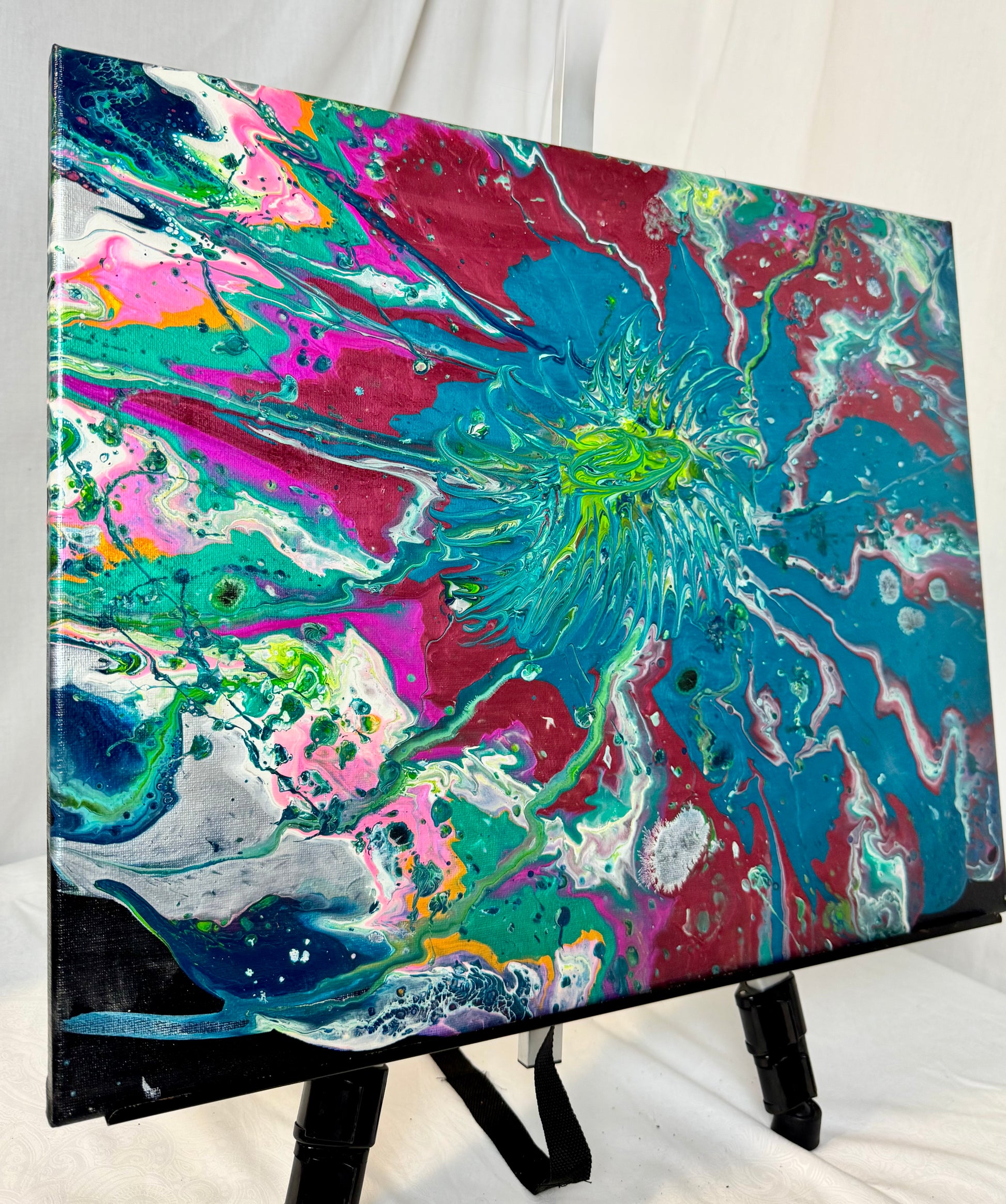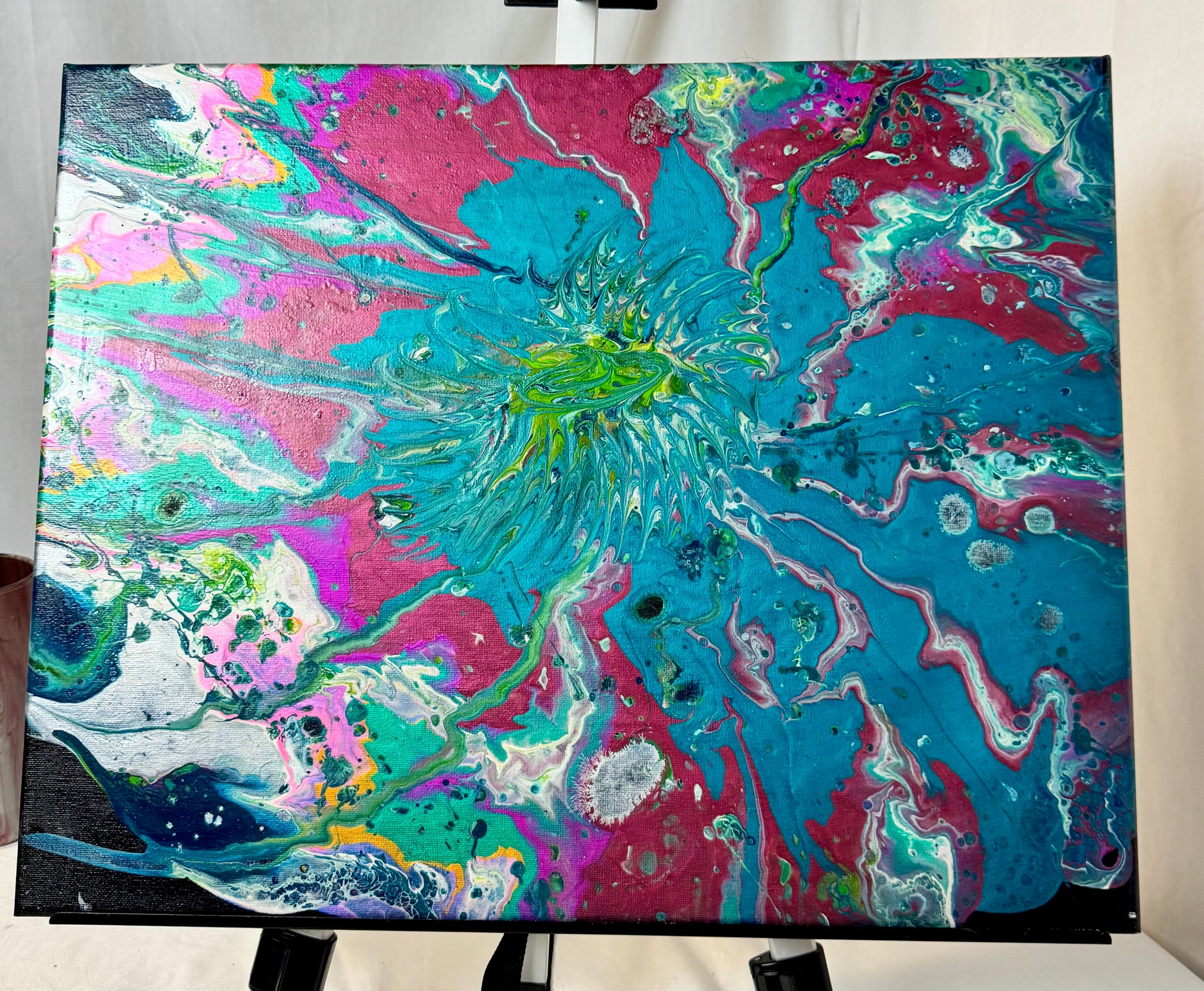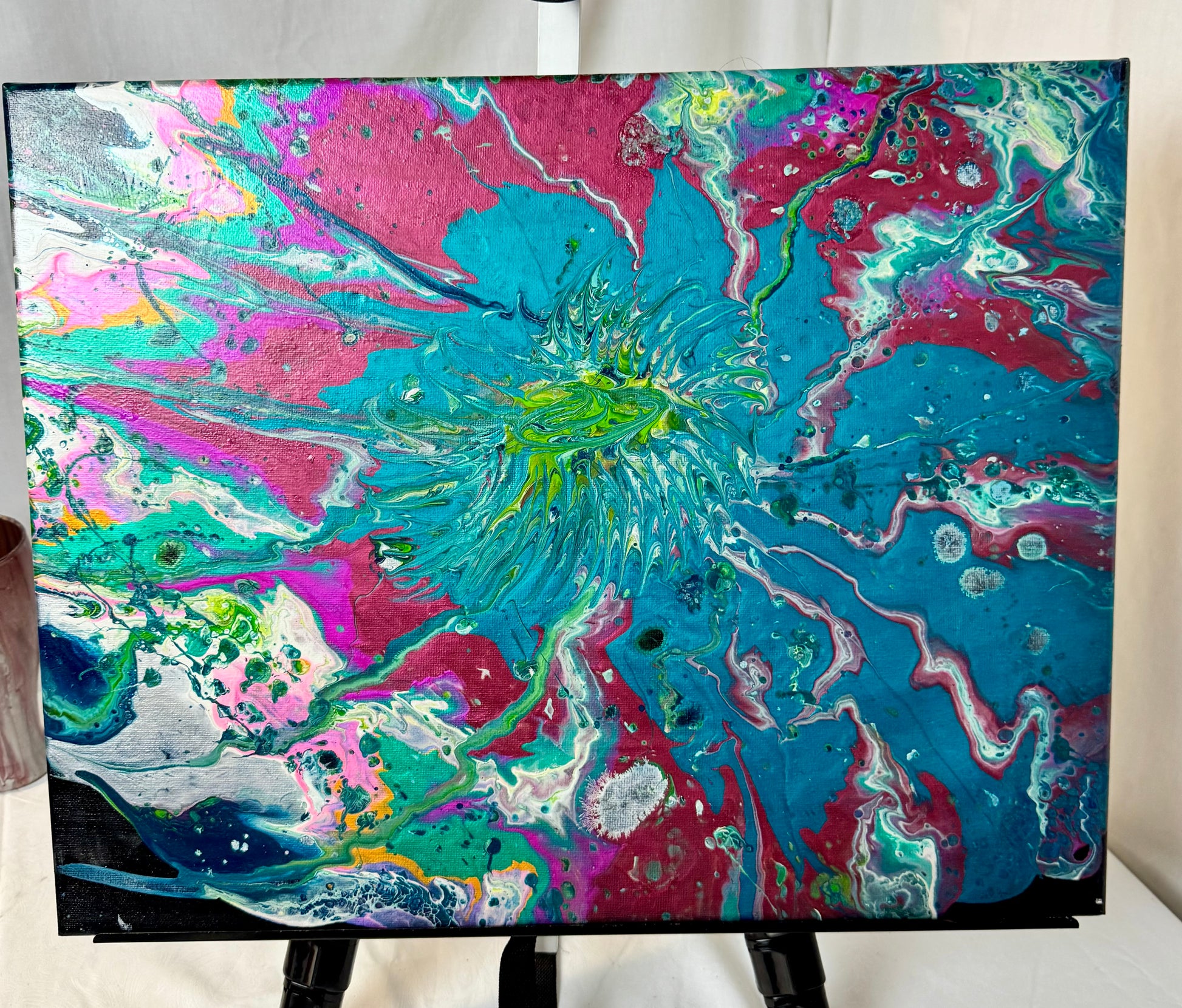 Experience a burst of color with Flower Explosion! This stunning 16X20" canvas paint pour painting is created with vibrant acrylic paints, making each piece truly unique. Transform any space into a lively and captivating environment with this breathtaking artwork.