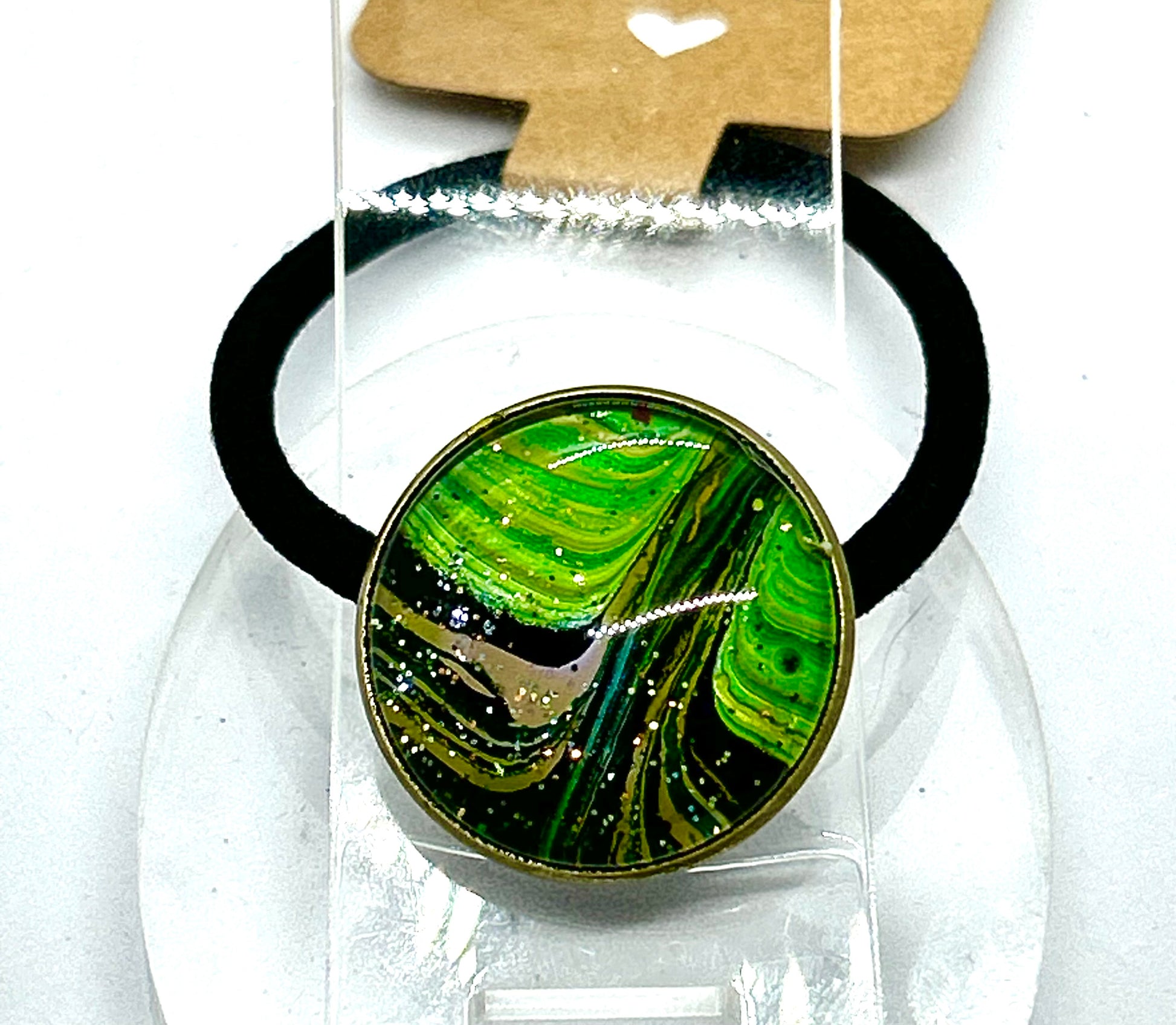 Experience a touch of sparkle and color with our Glass Domed Paint Poured Hair Tie! Infused with a mesmerizing blend of green, blue, and yellow glitter, this hair tie is truly one of a kind. Elevate your hair game and add a pop of color to any outfit with this unique and stylish accessory.