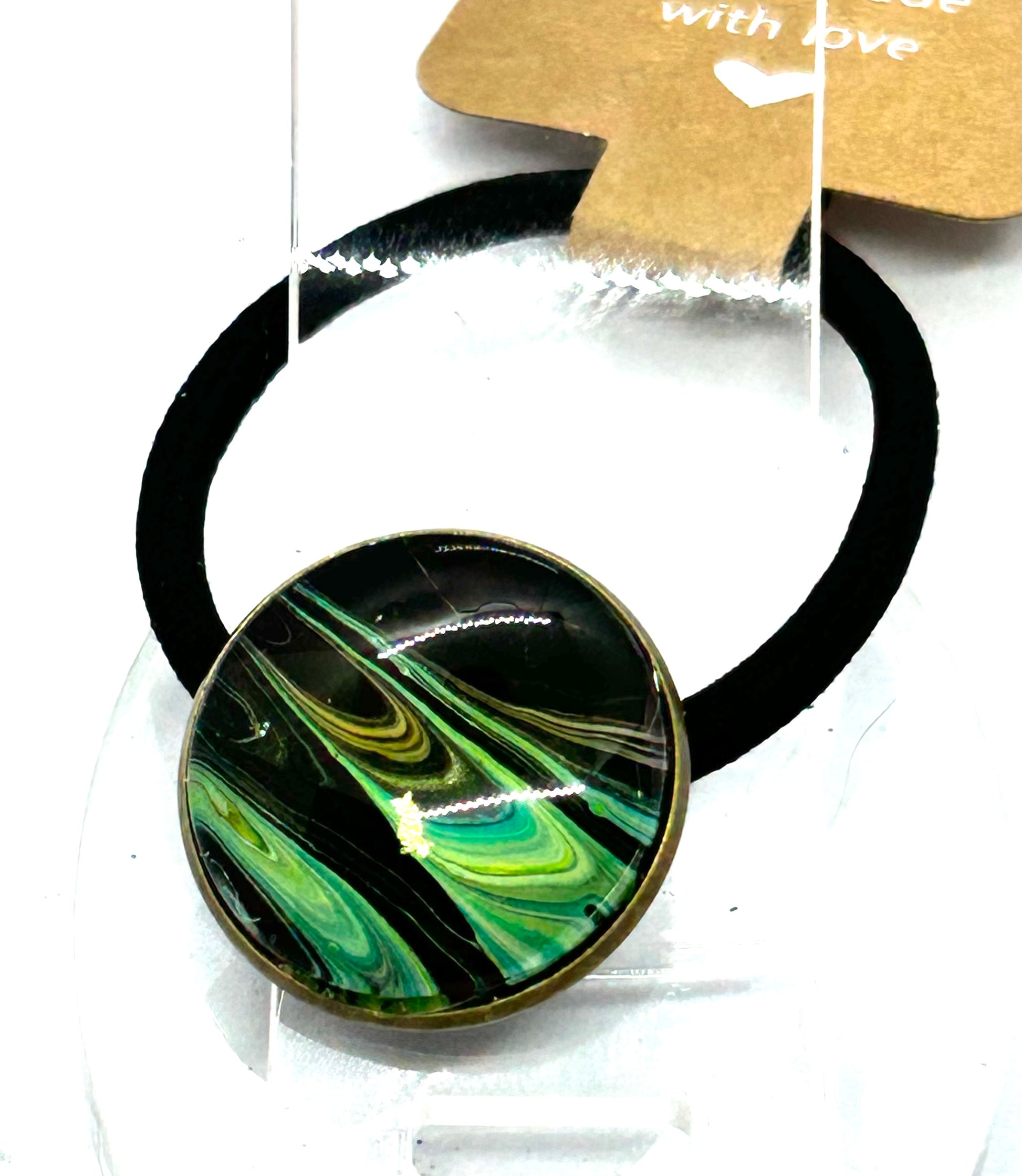 Upgrade your hair game with our stunning Glass Dome Paint Pour Hair Tie! Featuring a unique, hand-painted design encased in a glass dome, this hair tie is sure to make a statement. Keep your hair secure while adding a touch of artistry to any outfit. Elevate your style today!