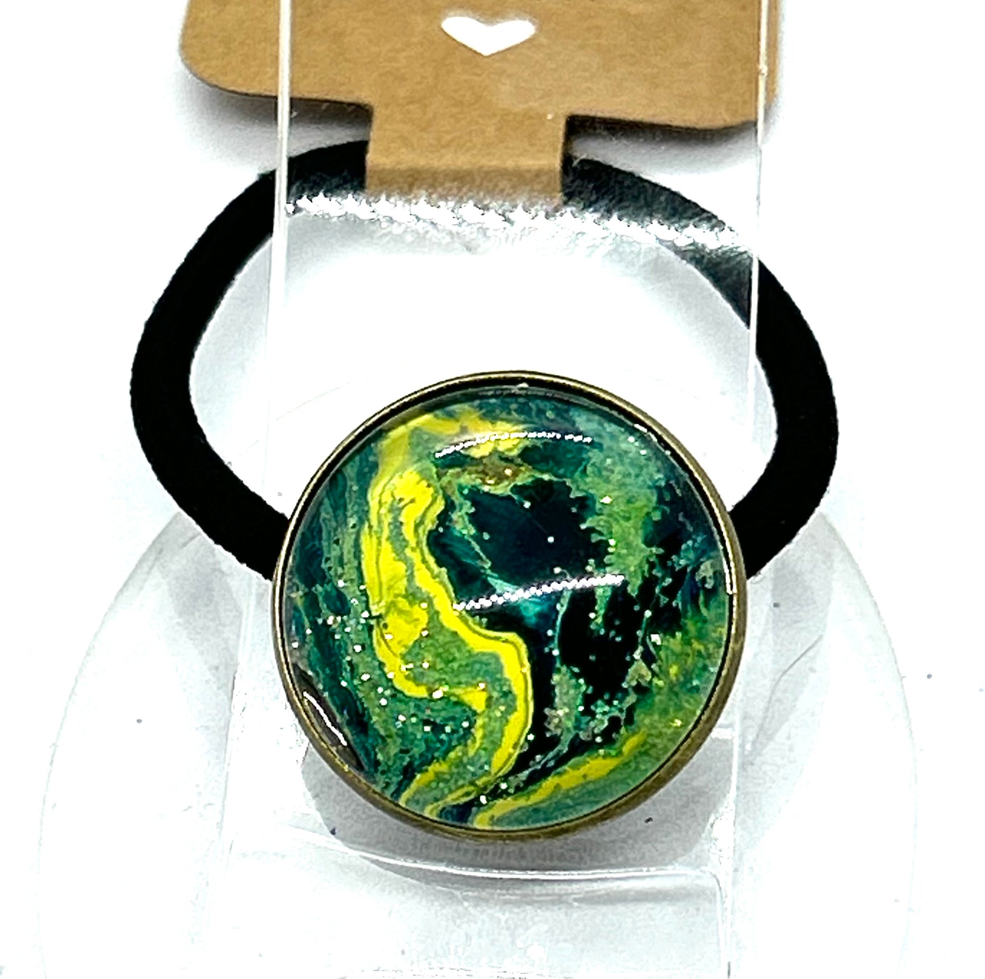 Handcrafted with vibrant yellow, blue, and glitter glass dome paint, this hair tie is a must-have for any hair accessory collection. Add a touch of color and sparkle to your hairstyle while keeping your hair in place. Perfect for everyday wear or special occasions. Elevate your look with this unique and eye-catching hair tie!
