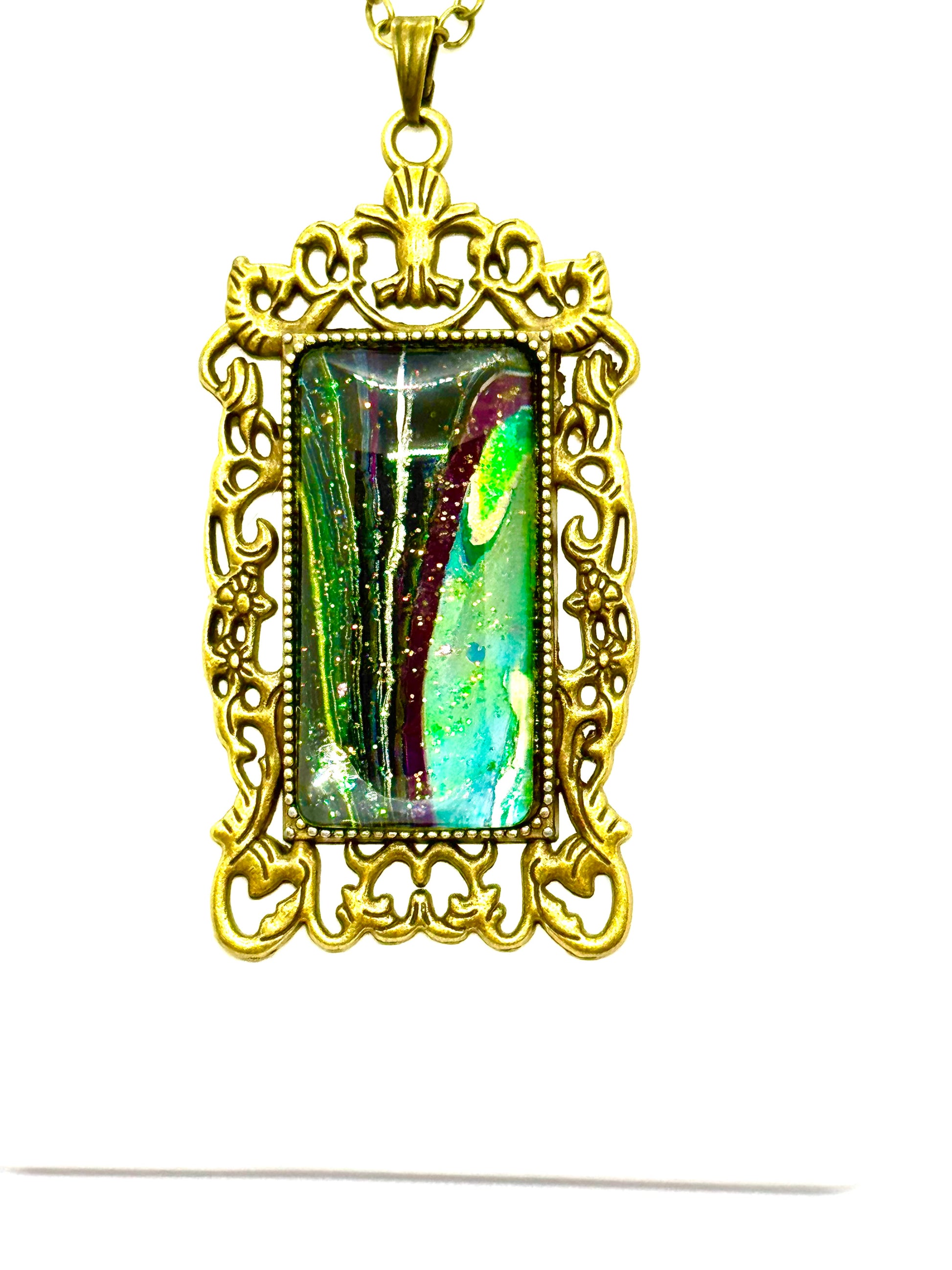 Elevate your style with our Large Paint Pour Pendant Necklace ! This unique necklace features a large rectangular pendant with stunning swirls of purple, blue, white, green, and black. Stand out and make a statement with this one-of-a-kind piece.