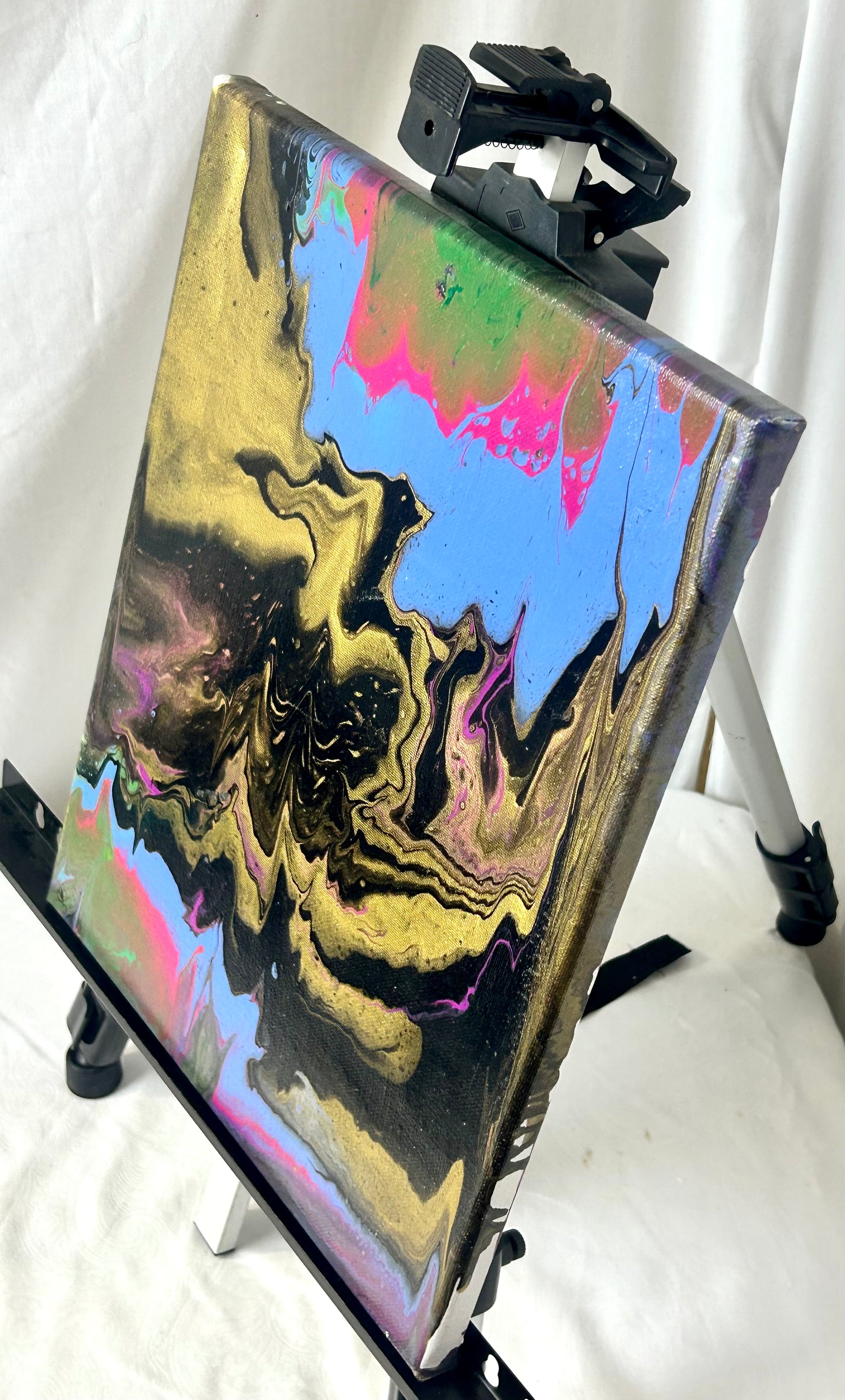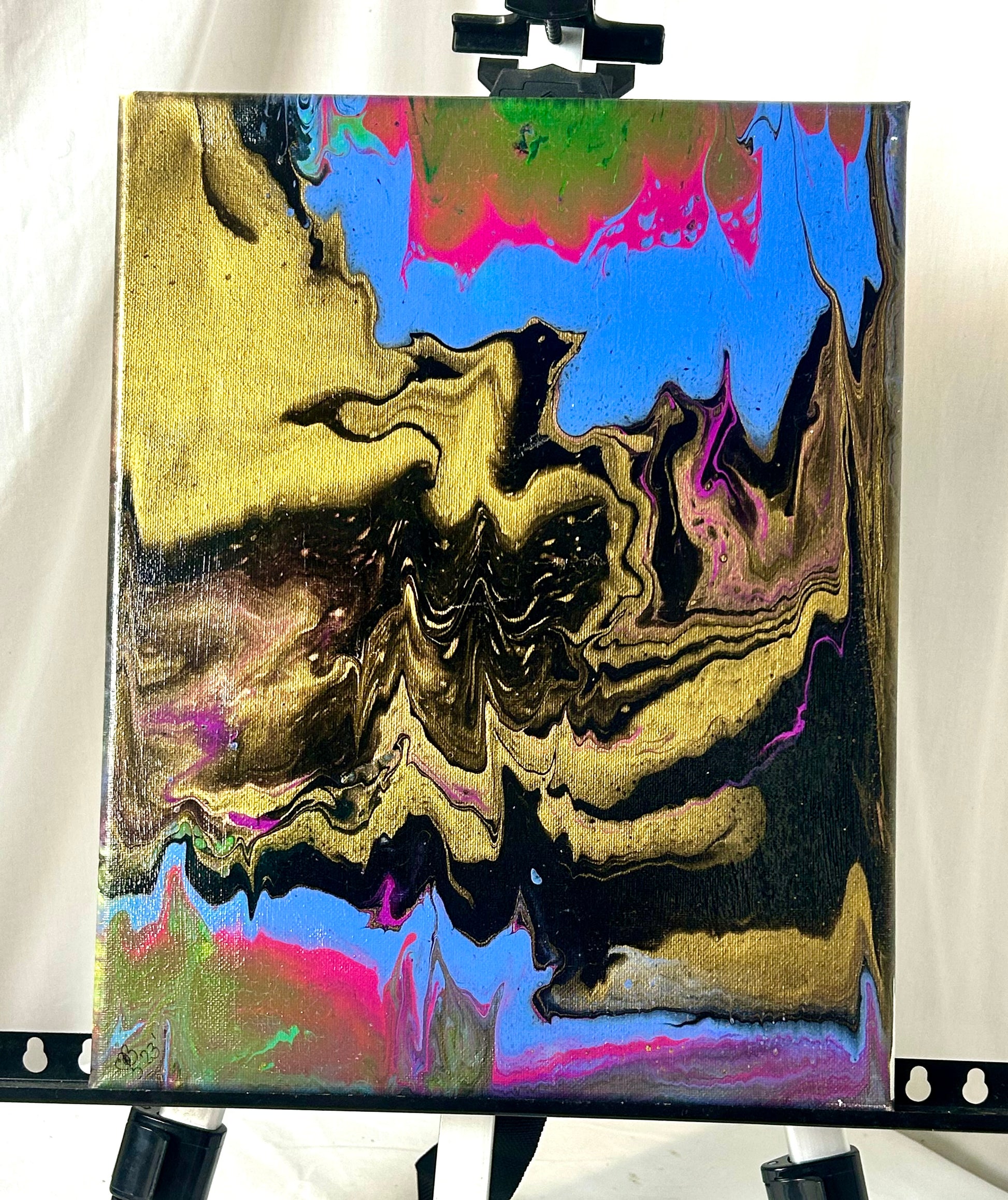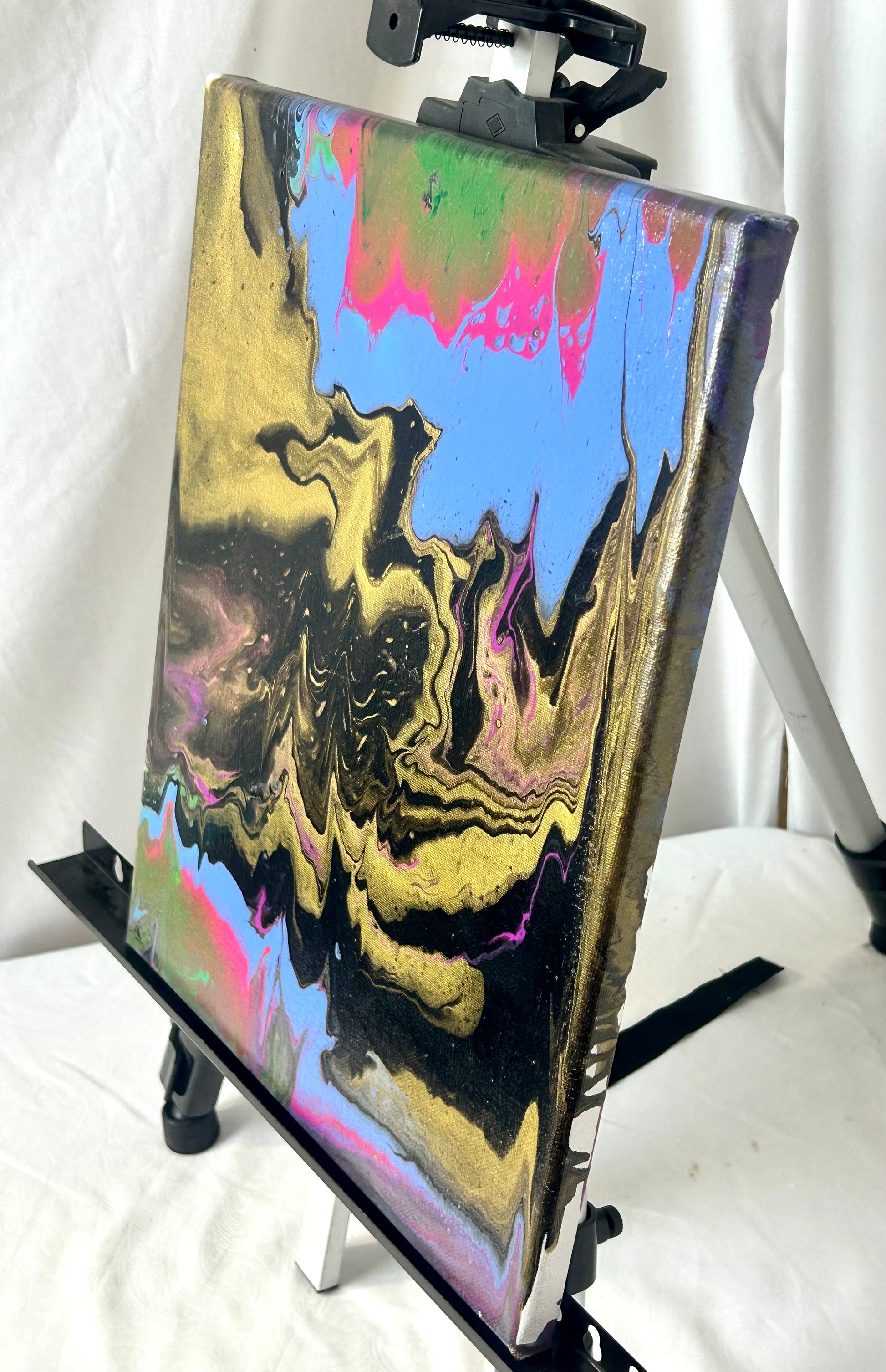 "Transform your space with the vibrant and captivating Money Flow painting. Measuring 11x14 inches, this acrylic masterpiece on canvas features a dynamic blend of black, blue, green, pink, and gold hues. Add an instant pop of color and energy to any room with this stunning piece!"