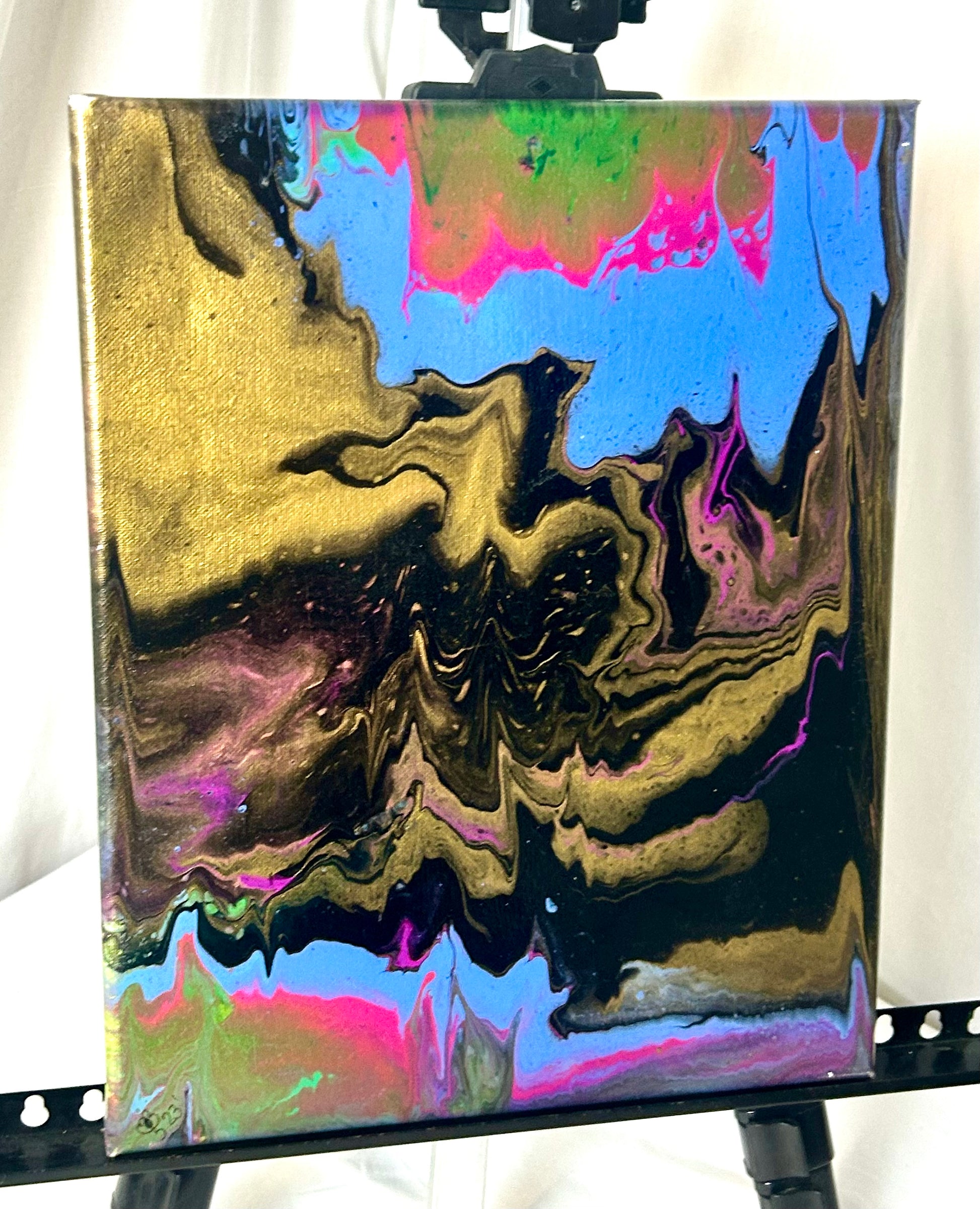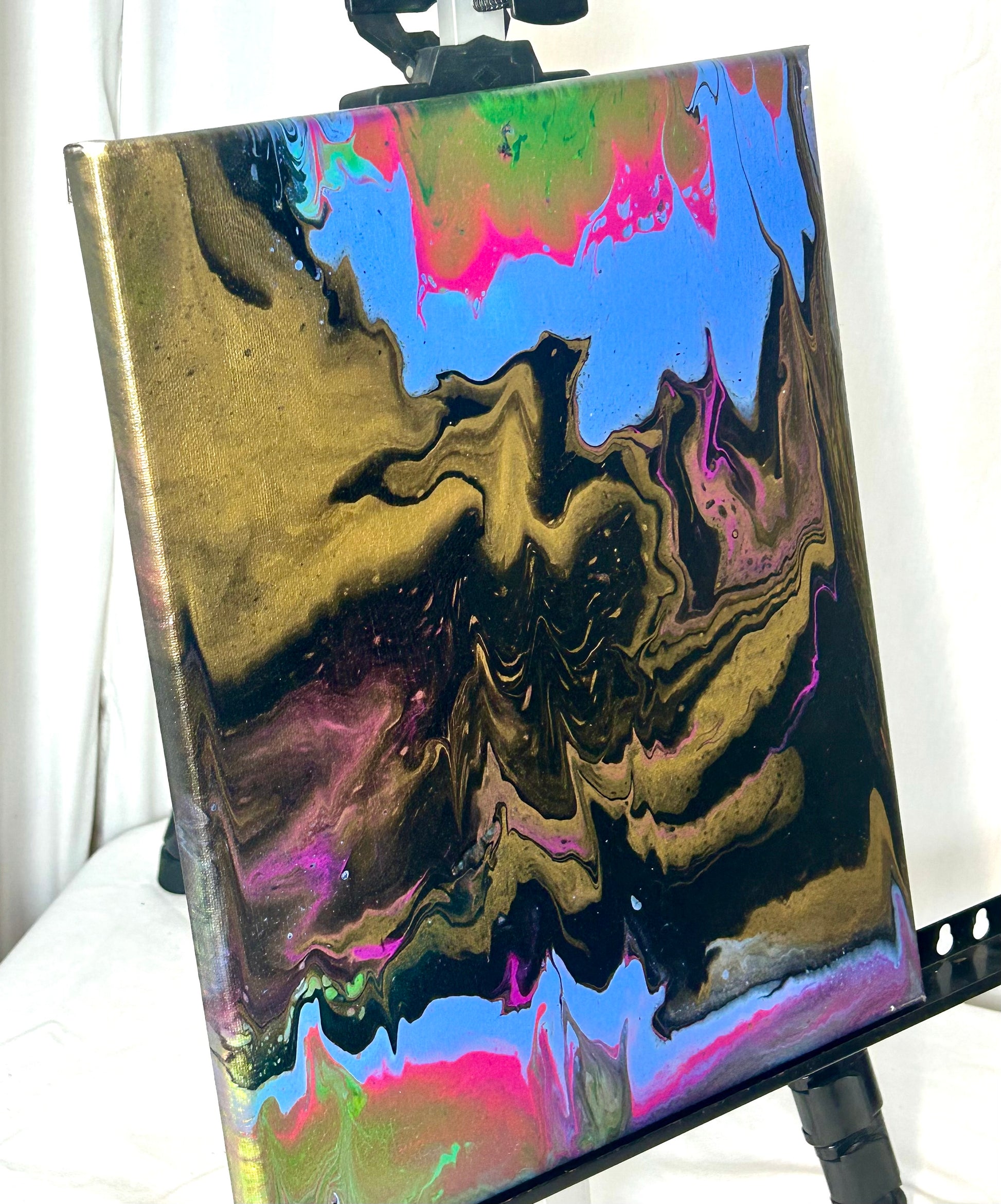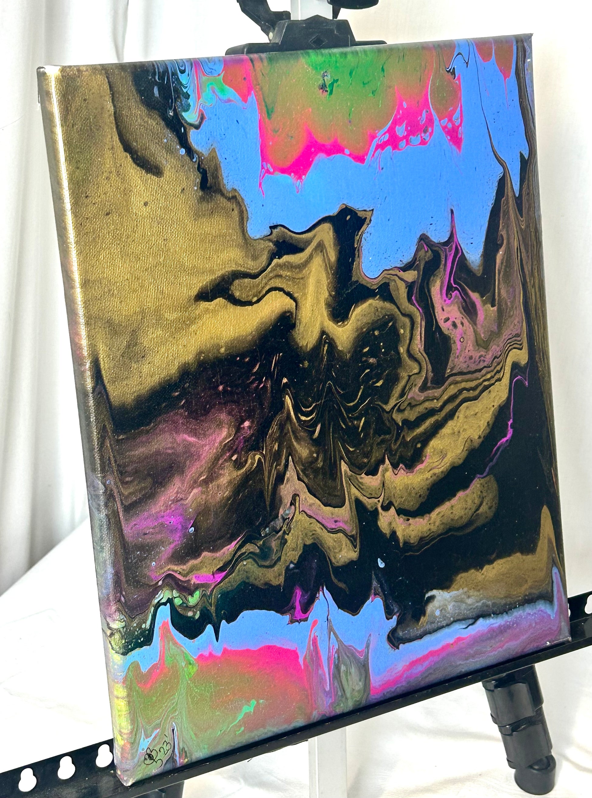 "Transform your space with the vibrant and captivating Money Flow painting. Measuring 11x14 inches, this acrylic masterpiece on canvas features a dynamic blend of black, blue, green, pink, and gold hues. Add an instant pop of color and energy to any room with this stunning piece!"