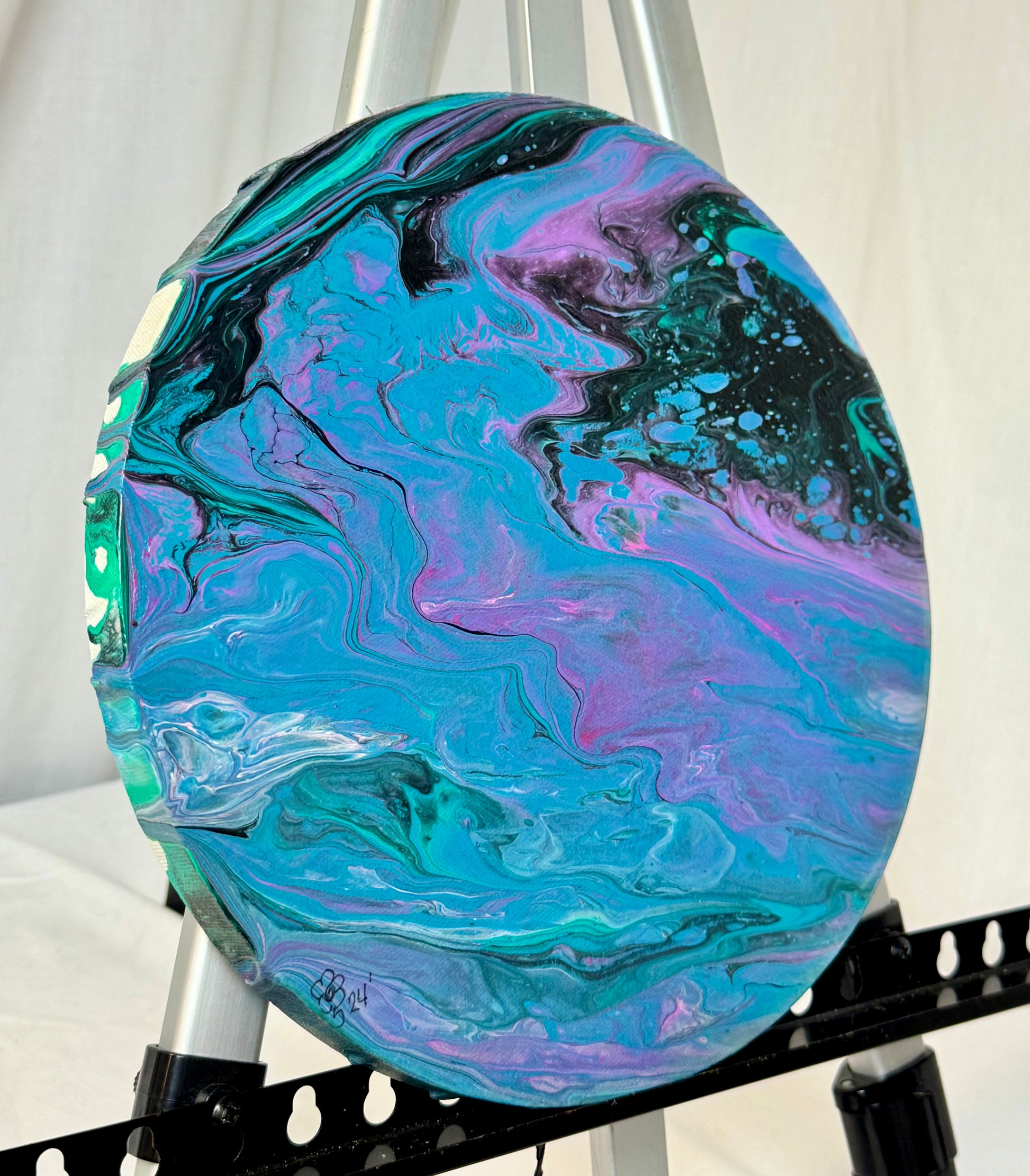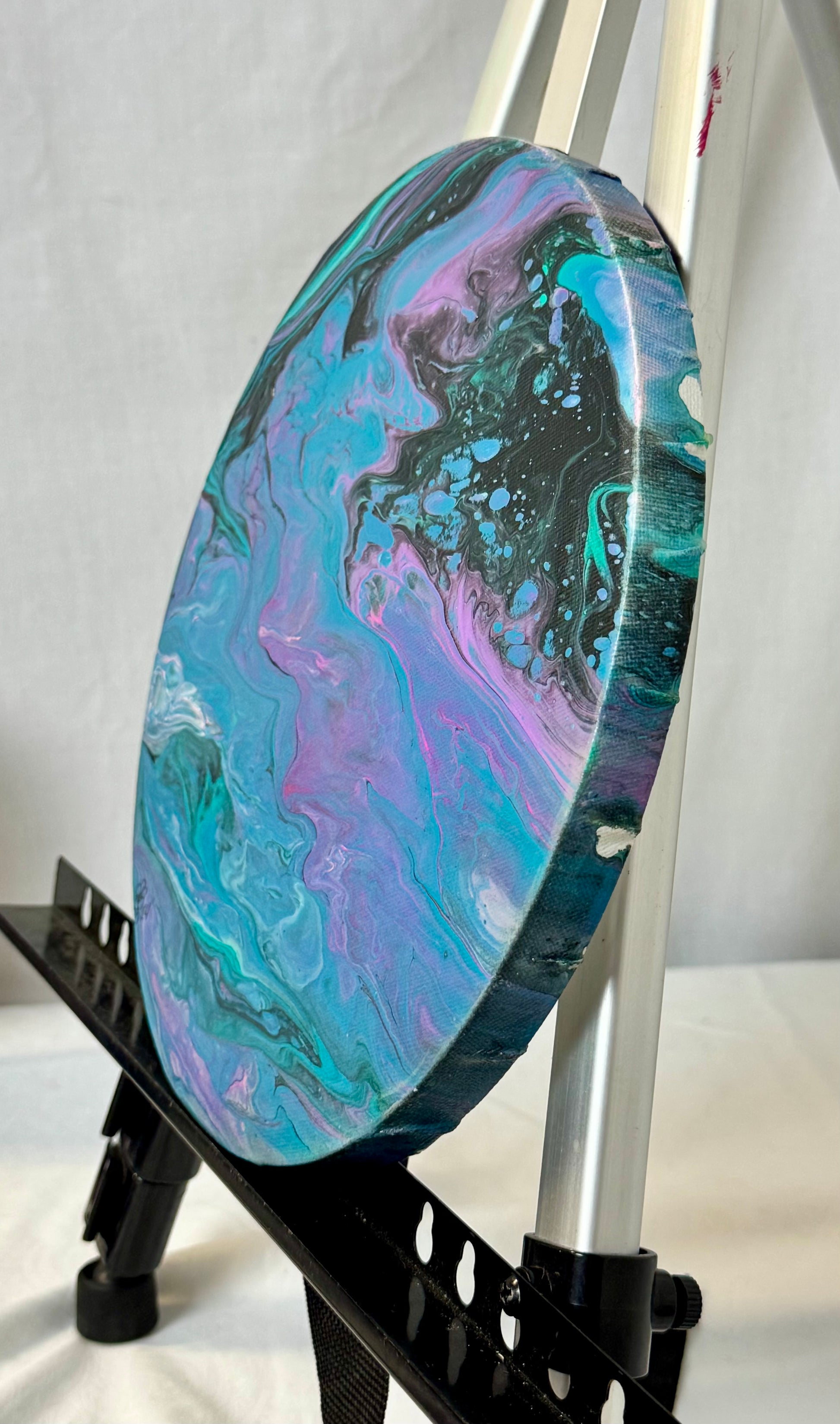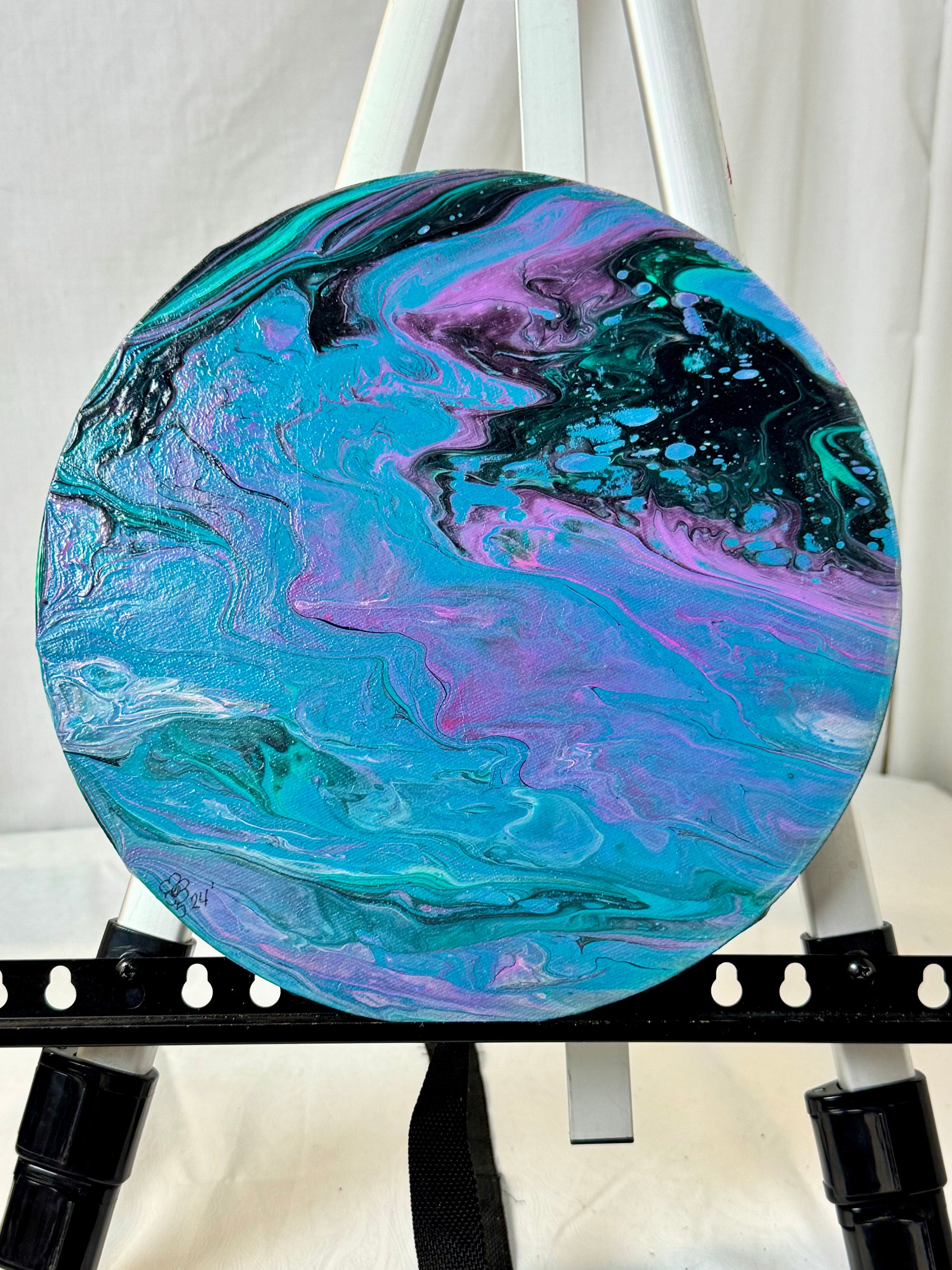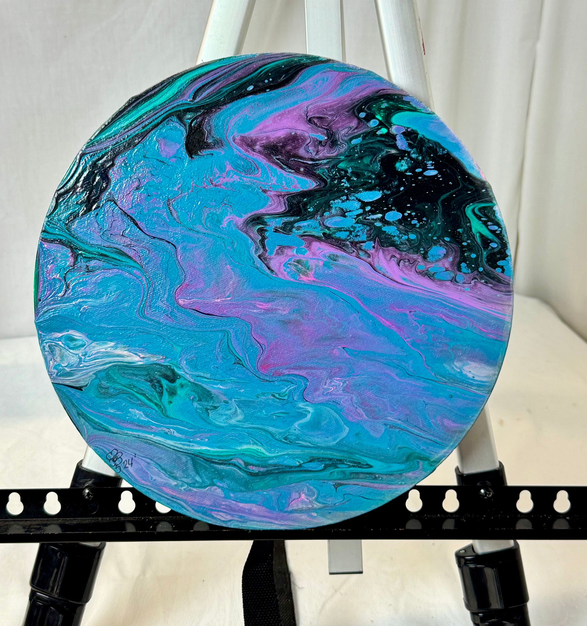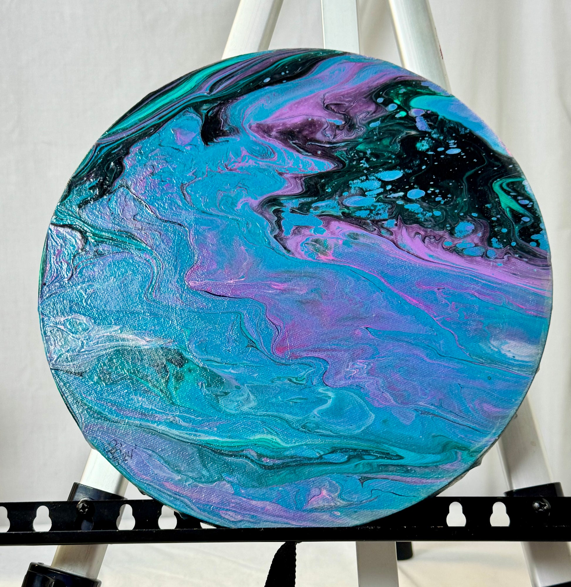 Experience the captivating beauty of Moon. This 10" round canvas is crafted with acrylic paint, creating a unique paint poured design that will add a touch of elegance to any space. Embrace the mesmerizing colors and textures that will inspire your senses and elevate your home decor.