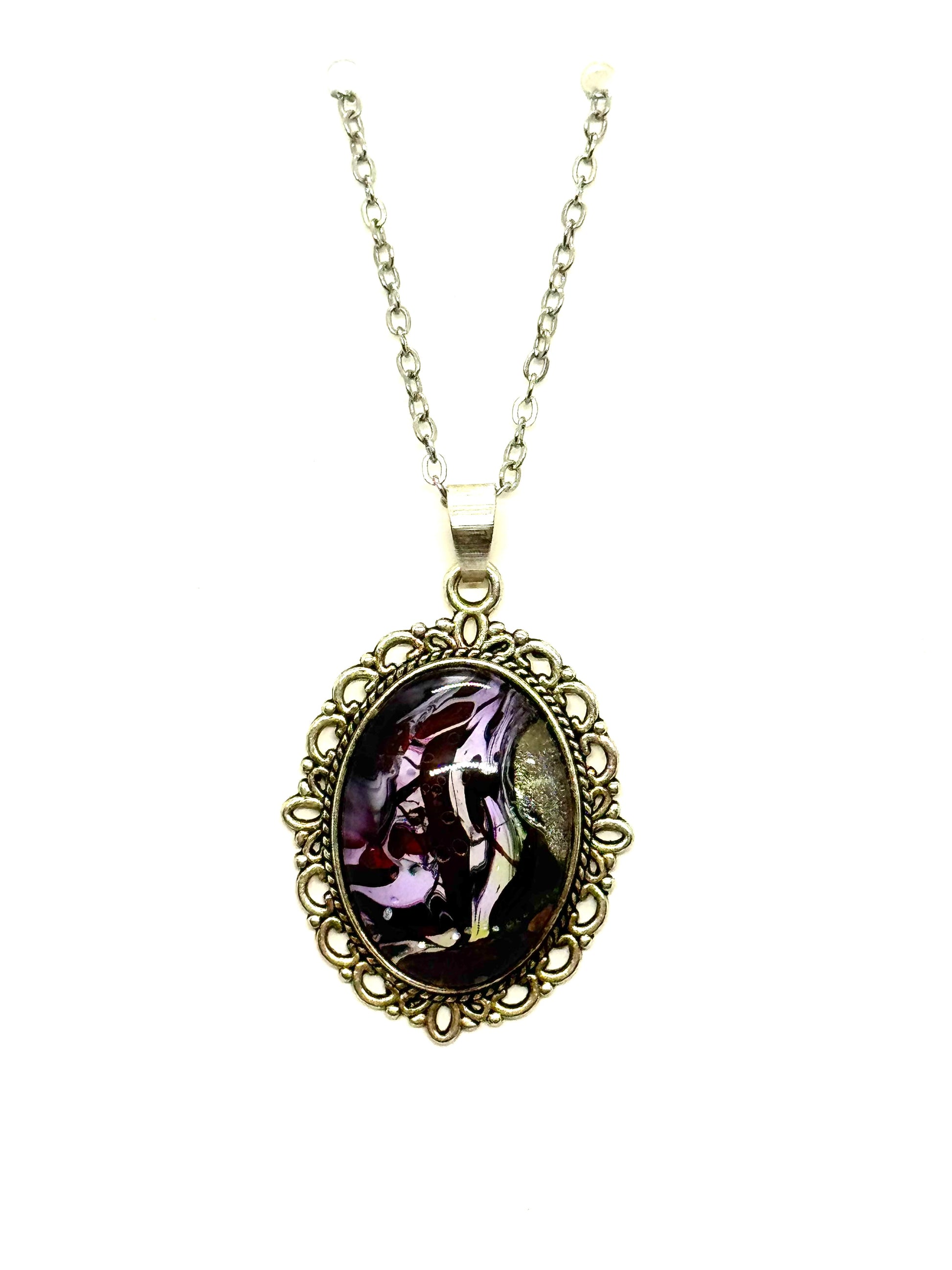 Experience the beauty of abstract art with our Paint Pour Oval Pendant Necklace! The oval pendant is filled with swirls of vibrant purple paint, creating a unique and eye-catching design. Add a touch of color and creativity to your outfit .
