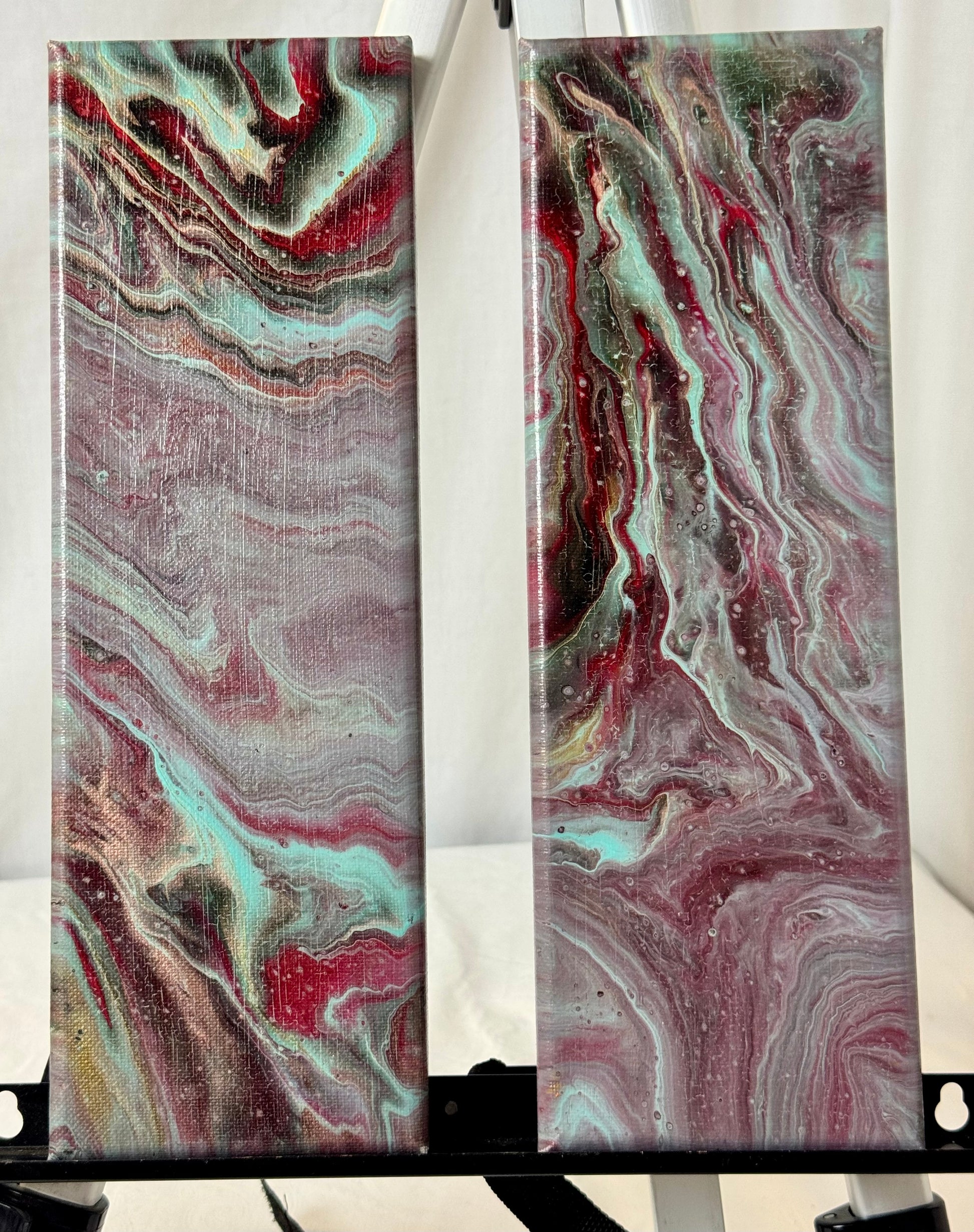 Experience the power of choice with Pathway Choices! This unique set includes 2 stunning canvas panels, each expertly painted with black and red acrylics in a mesmerizing paint pour style. Add a bold touch to your home decor or gift it to ignite inspiration in others. 2 - 4X12” panels.
