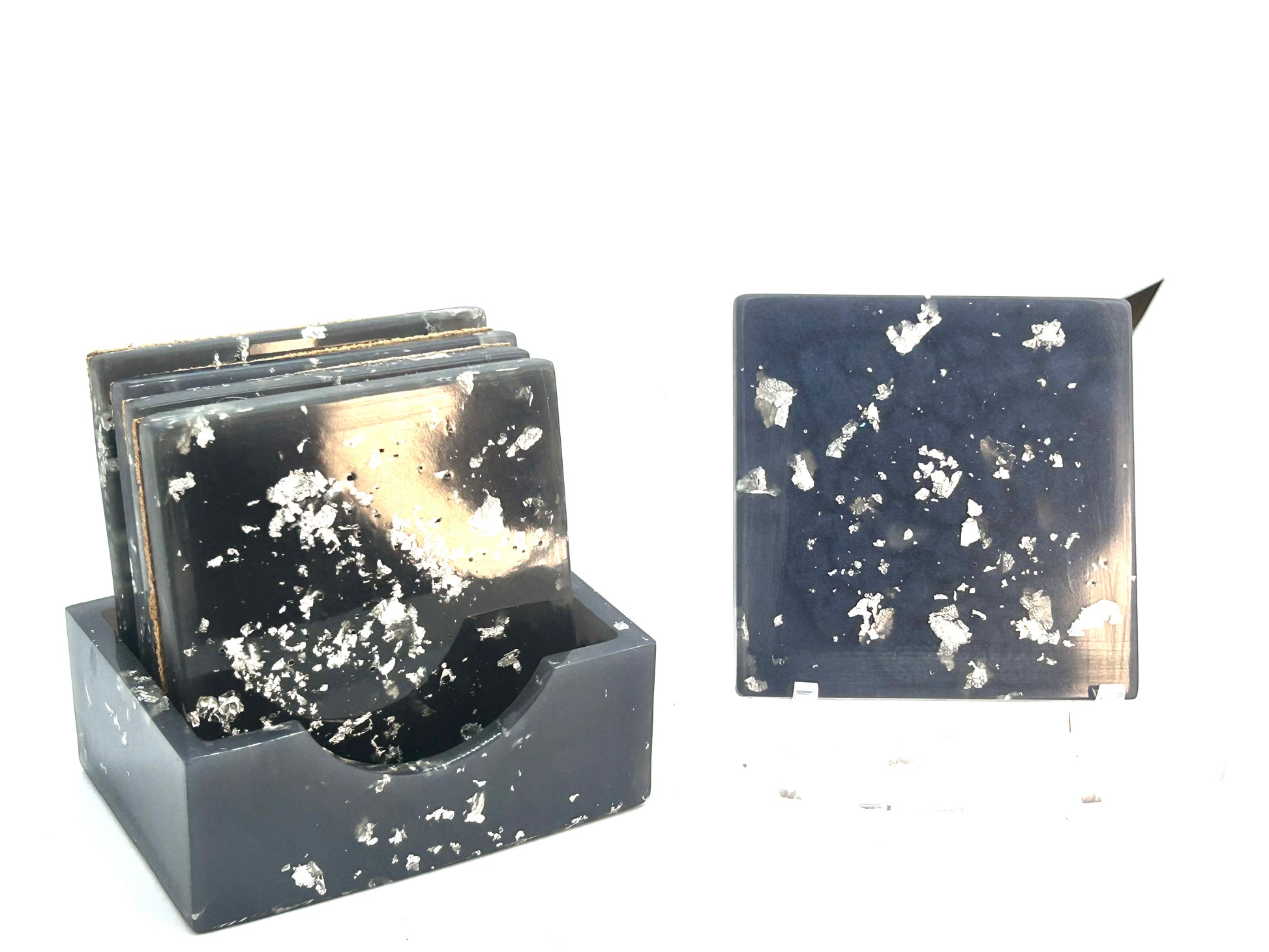 Elevate your home decor with our 5pc Coaster Set! Each midnight blue coaster is adorned with shimmering silver foil for a touch of elegance. The cork backing ensures your surfaces stay protected. Perfect for hosting or as a gift for any occasion!