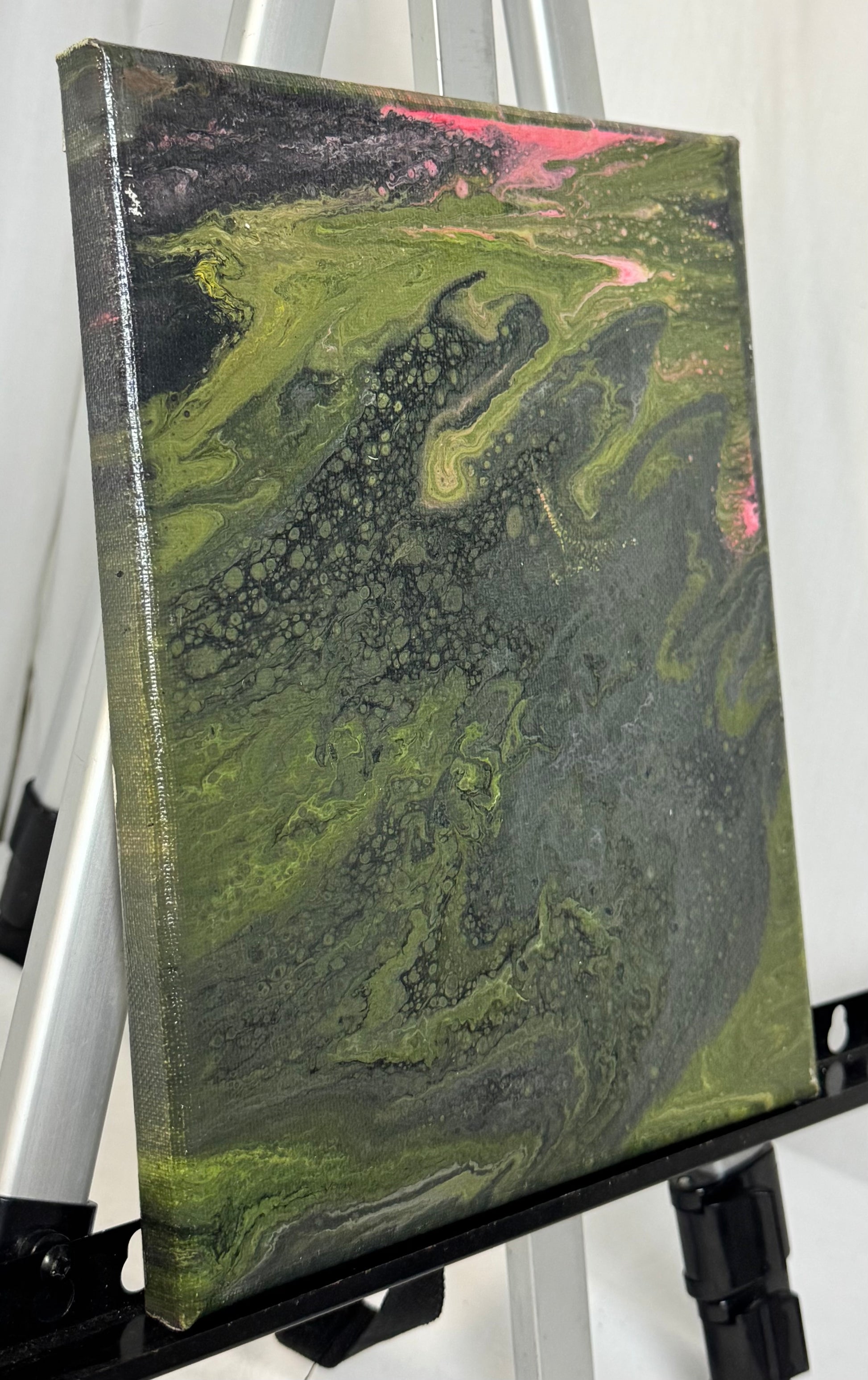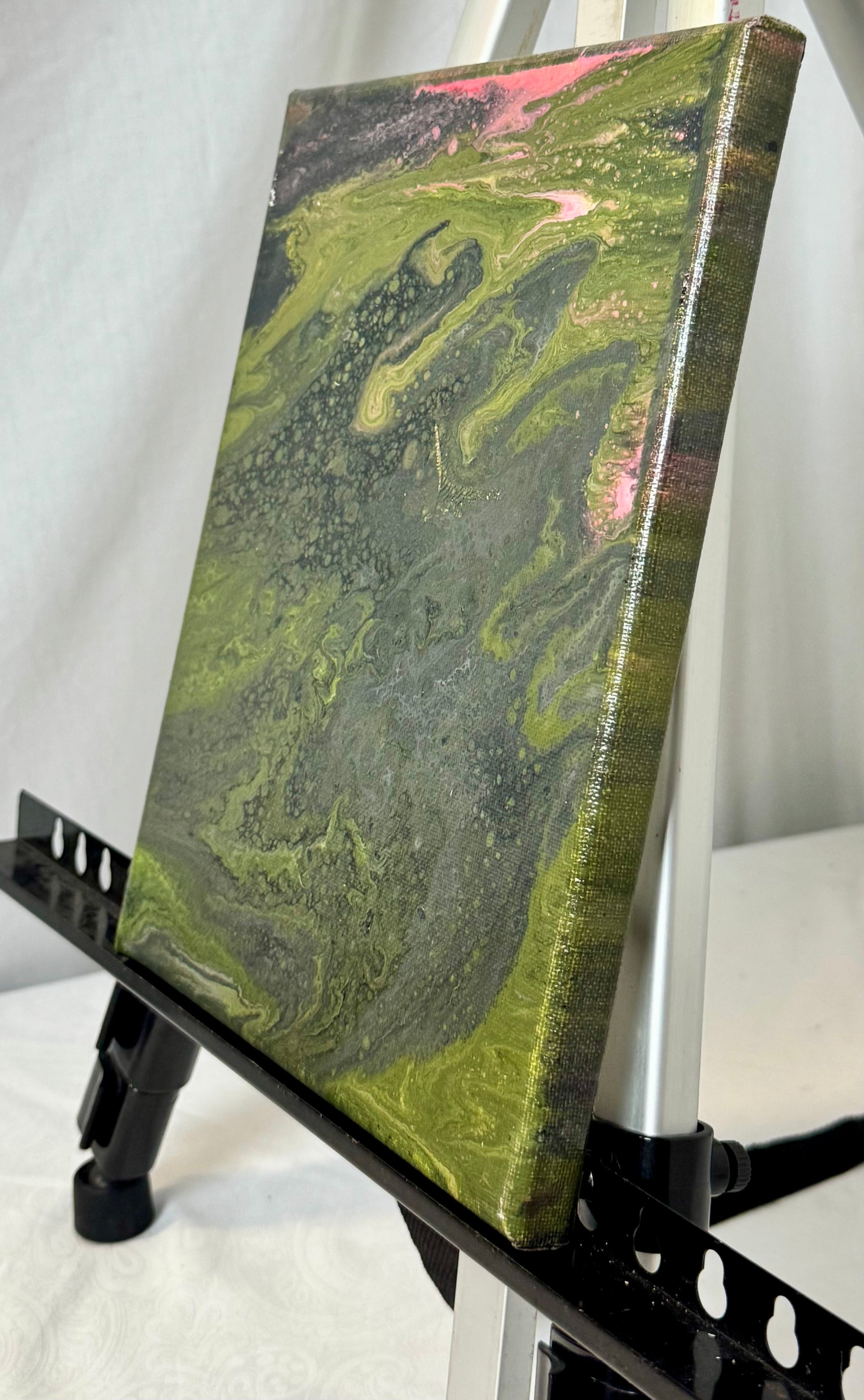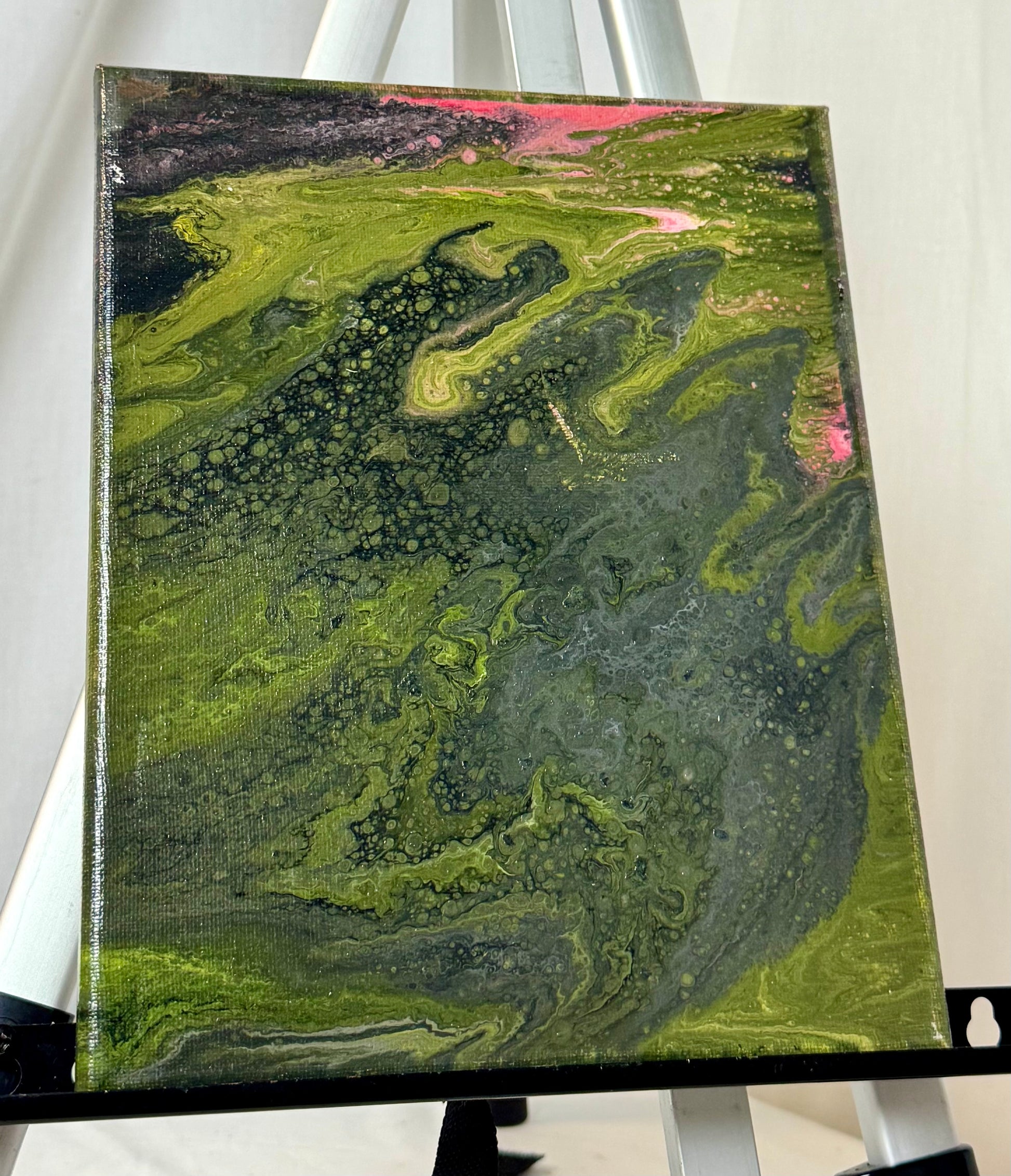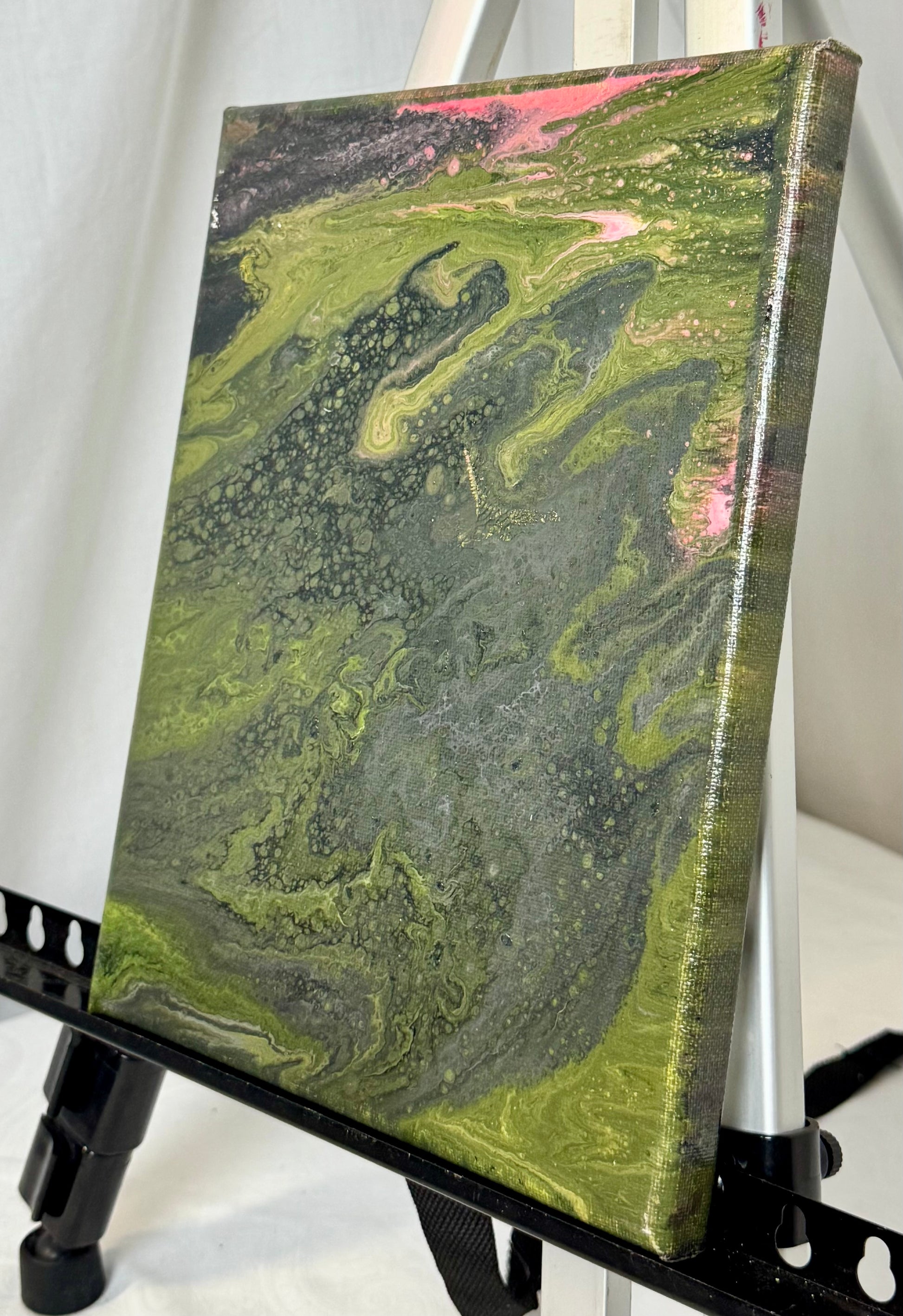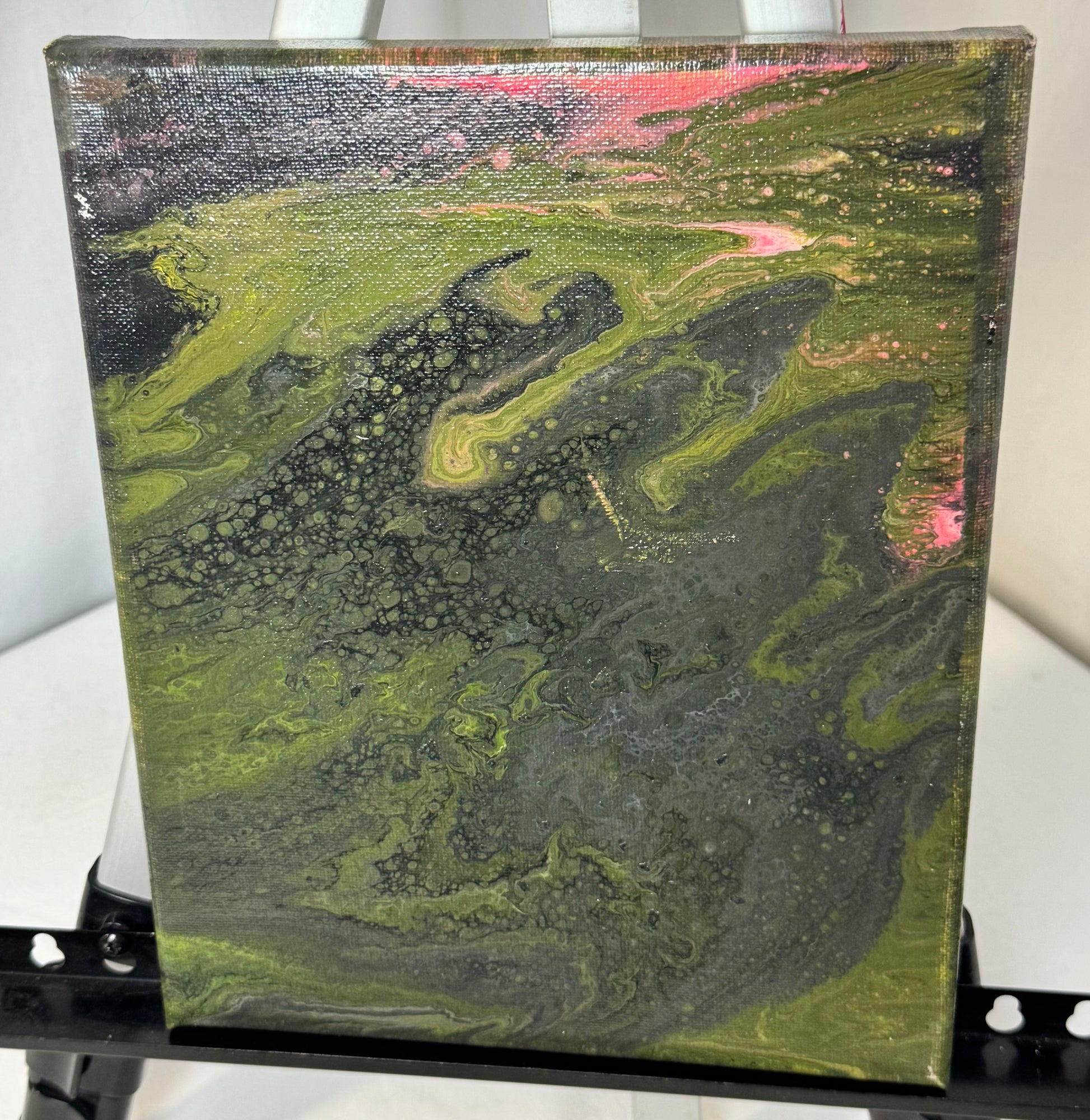Brighten up your living space with the Aerial Delta paint pour painting! This stunning 8x10" canvas is adorned with vibrant green, red, and pink hues created with high-quality acrylic paint. Add a pop of color to your home decor with this unique and eye-catching piece.