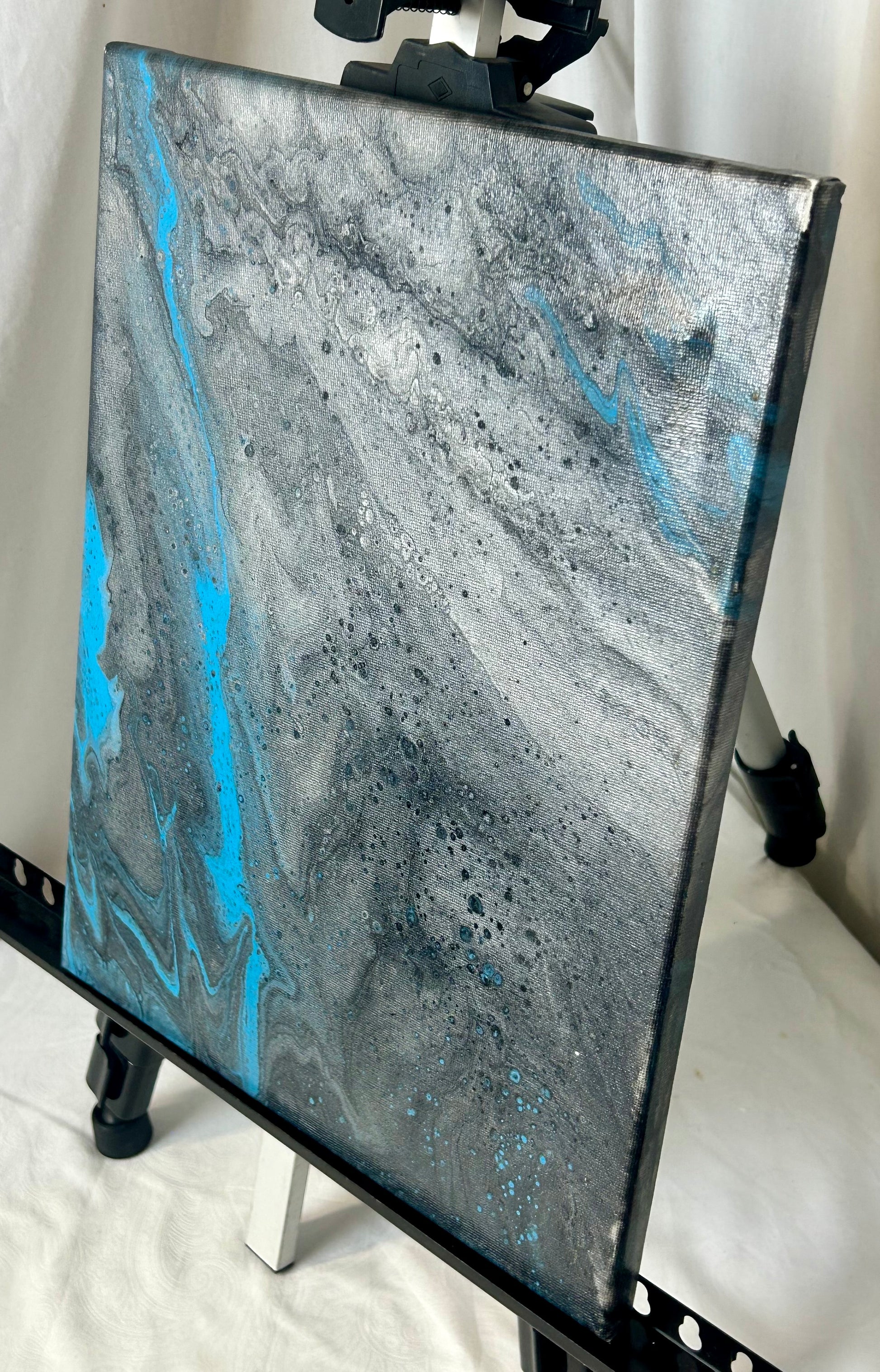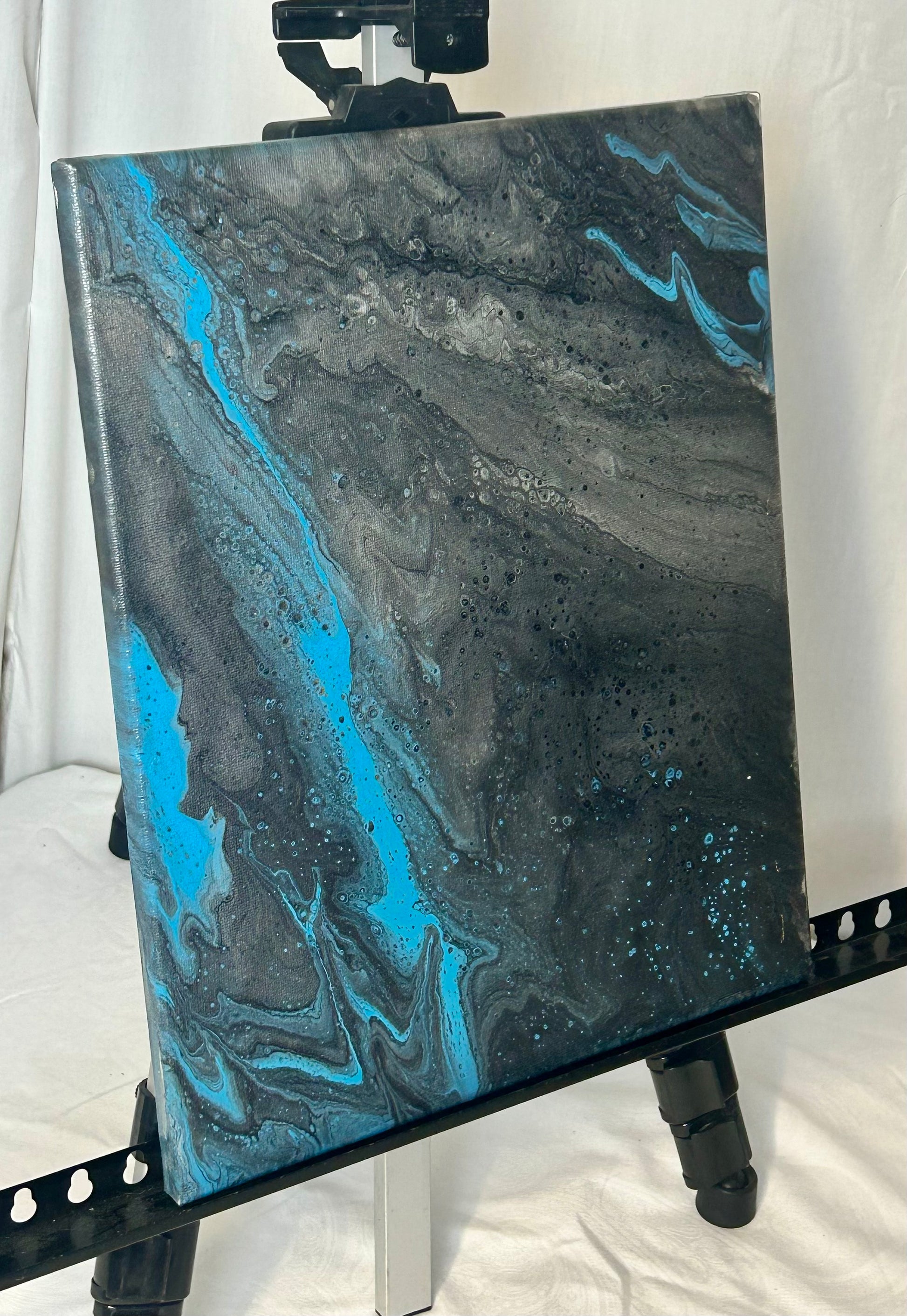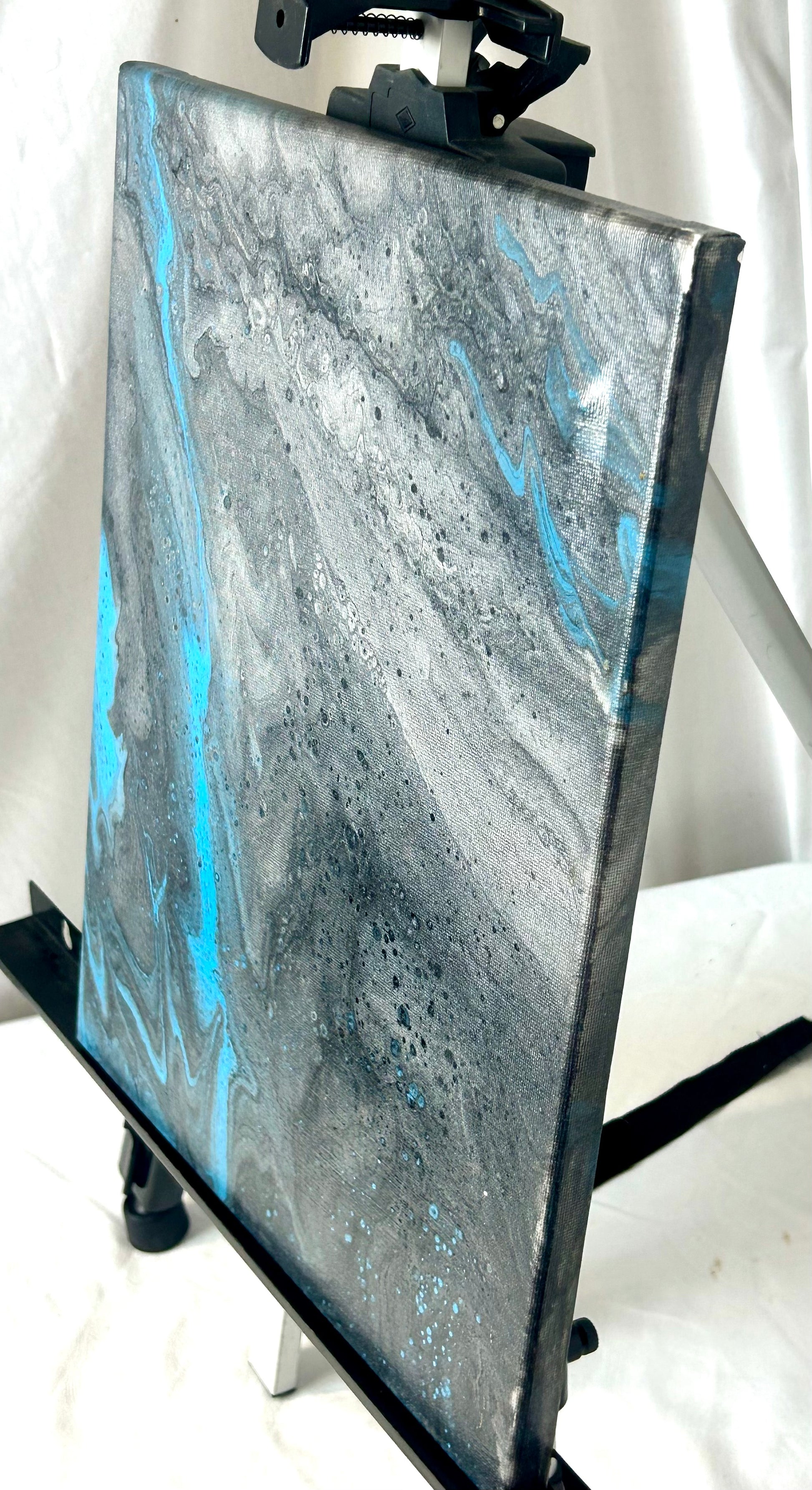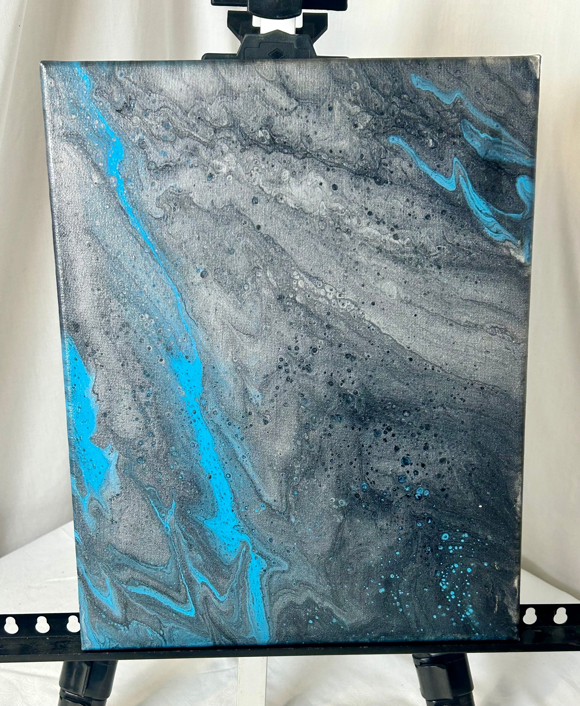 Experience the captivating beauty of our Blue painting. This 11x14" acrylic masterpiece on canvas features stunning hues of blue, black, white, and silver. Transform any space with this elegant and modern piece that will surely inspire strong emotions in the viewer.
