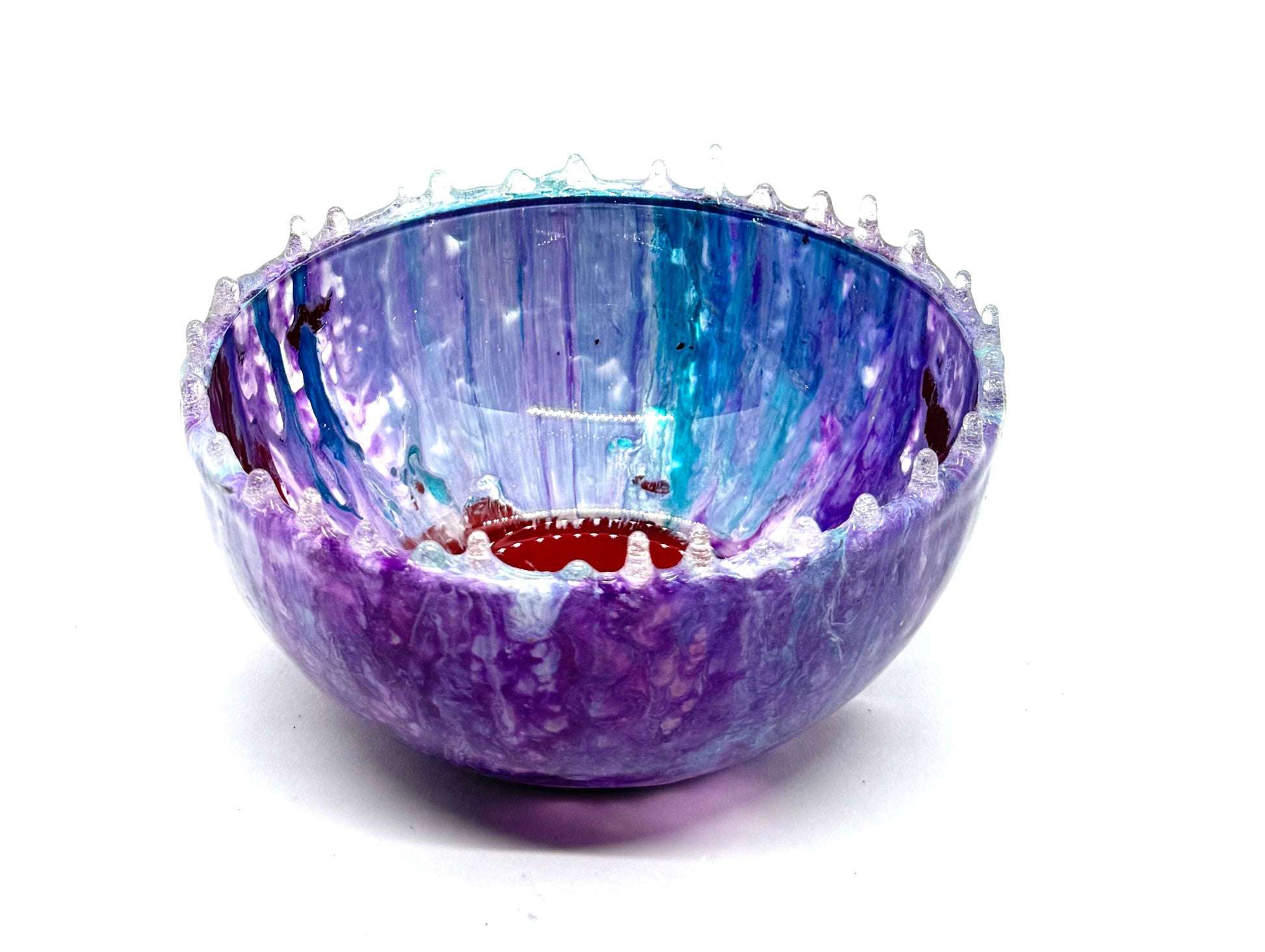 Hand-poured resin chaos in deep purples, moody teals, and “how did that happen?” swirls, finished with a jagged drip rim that looks sharp enough to have opinions. The inside hits with a glossy, dark red glow that makes whatever you put in it feel slightly dramatic — as it should.