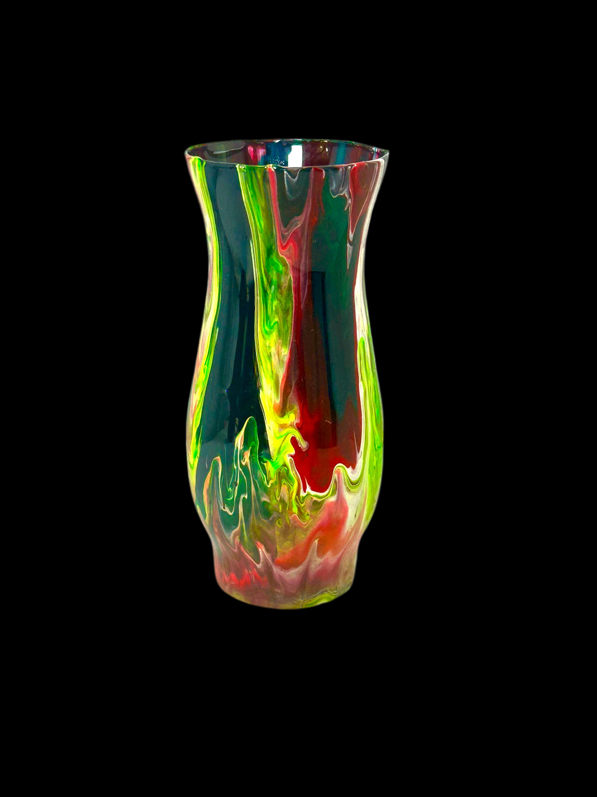 Transform any space with the vibrant and unique Flame vase. Featuring a striking blend of red, black, white, and green paint, each piece is carefully created and sealed with epoxy resin for a lasting finish. Add a touch of artistry and color to your home or office while supporting local artisans.