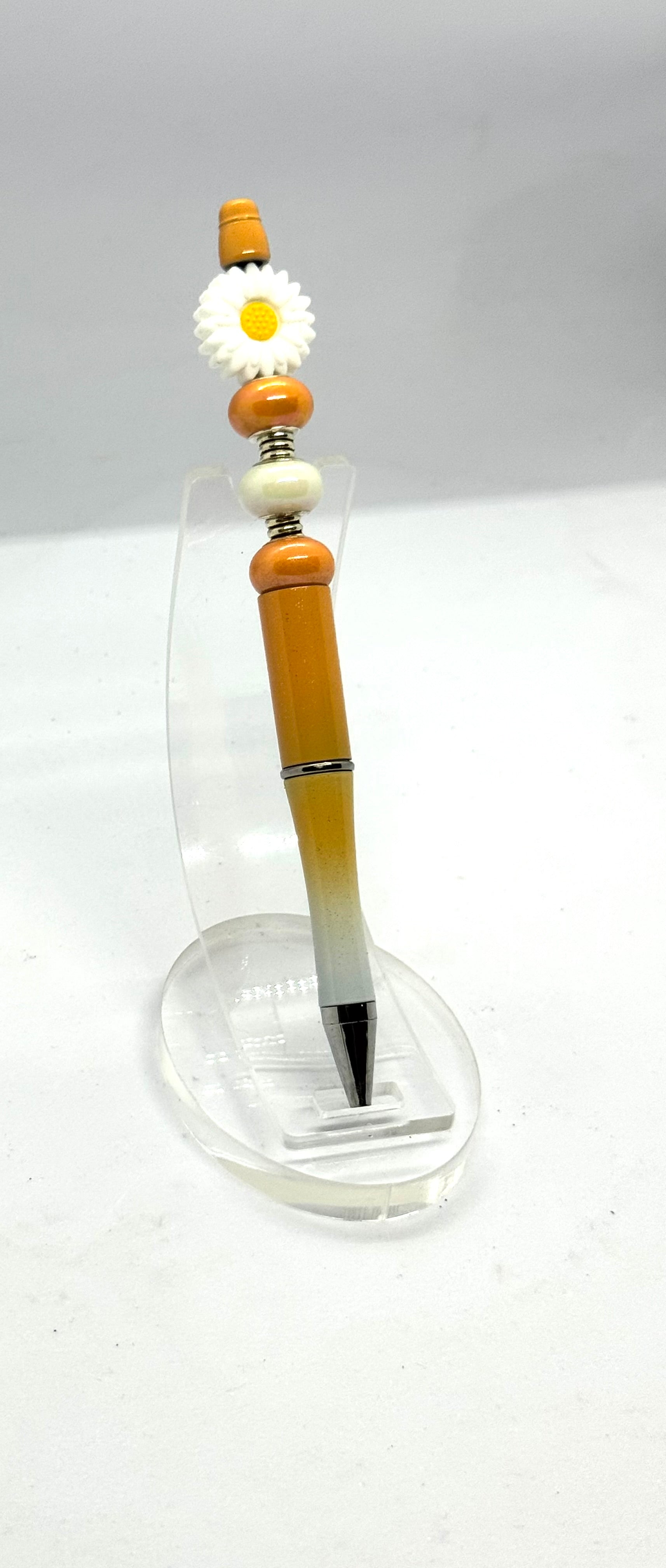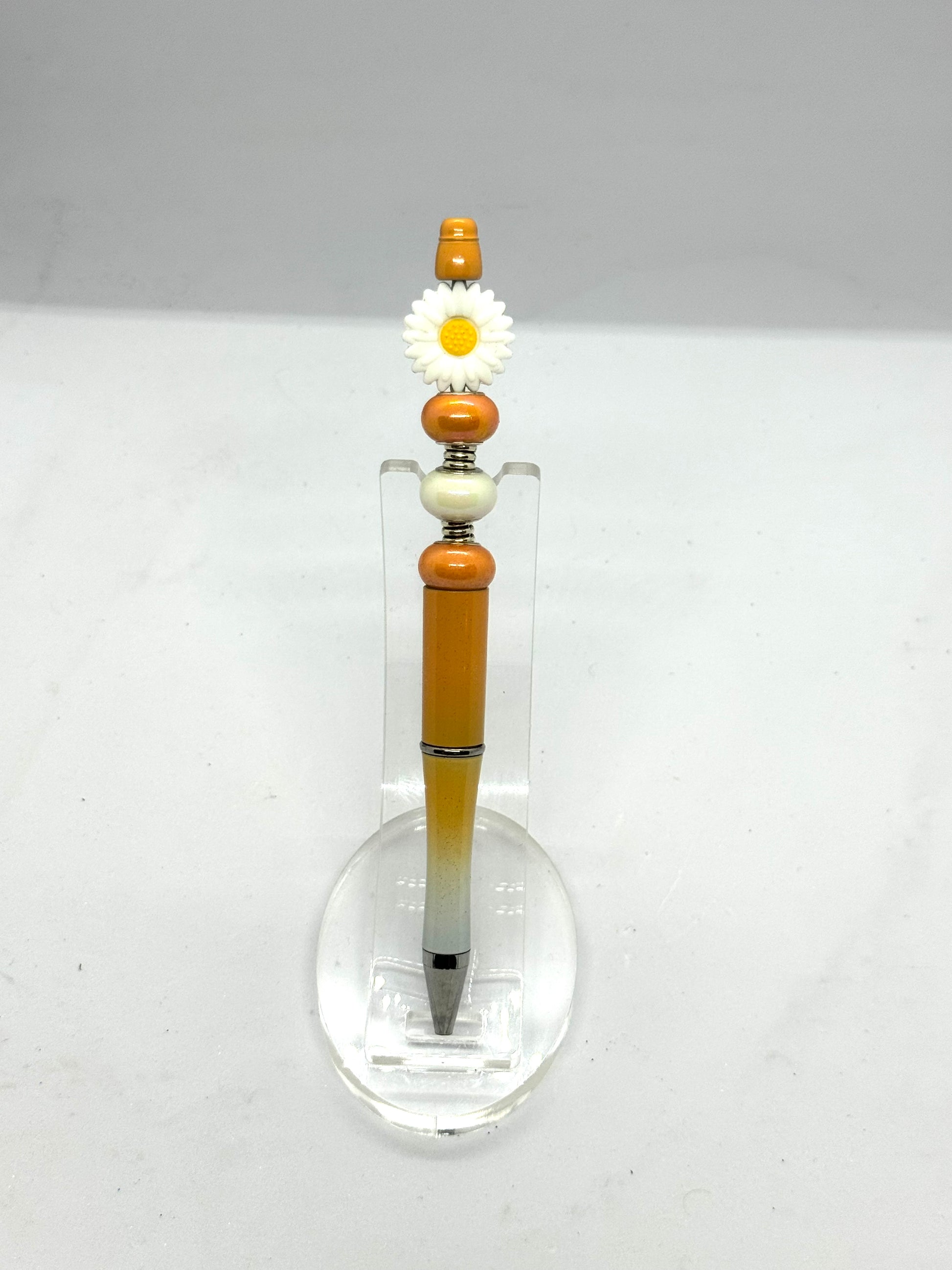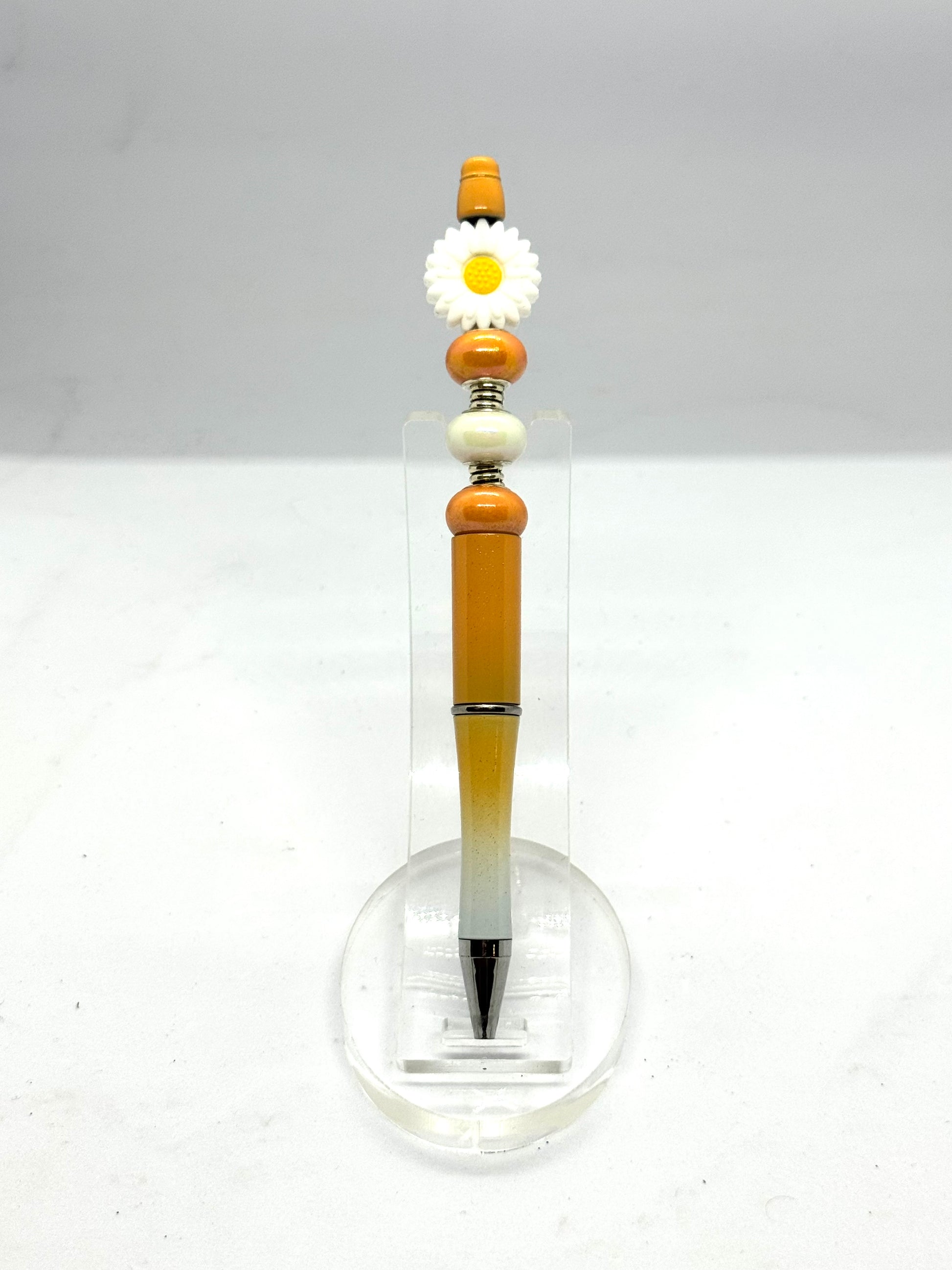 Elevate your writing experience with the Flower Pen! This unique pen features a vibrant orange and white design, adorned with a beautiful white silicone flower bead and orange and white acrylic beads. Make a statement with every stroke and add a touch of beauty to your daily tasks.