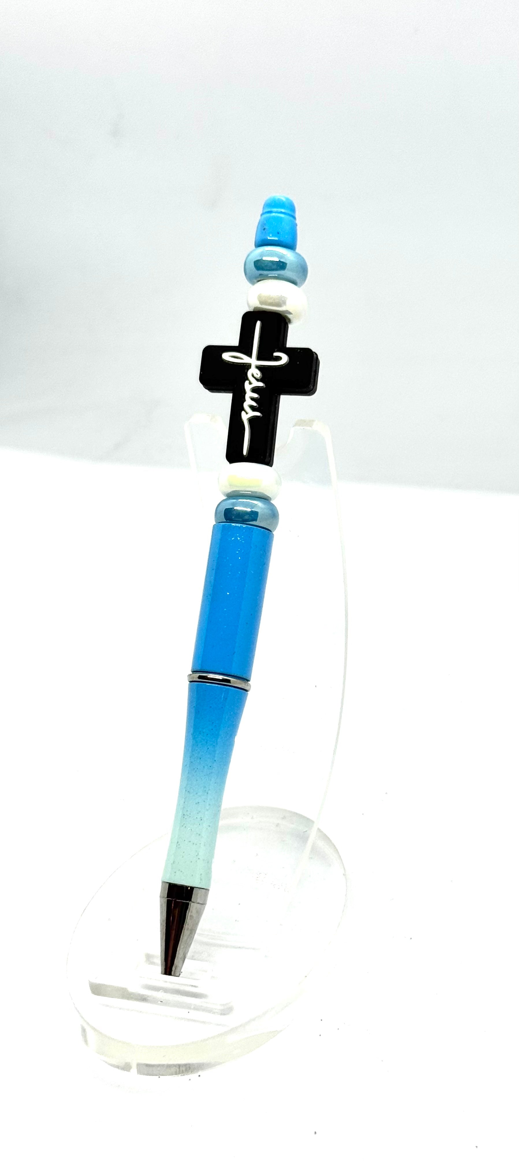 Indulge in your faith with the Jesus Pen. This beautiful blue and white hombre pen features acrylic and silicone beads, including a cross/Jesus bead, which serve as a reminder of your beliefs. Let your words be guided by your spirit with this inspiring and unique pen.