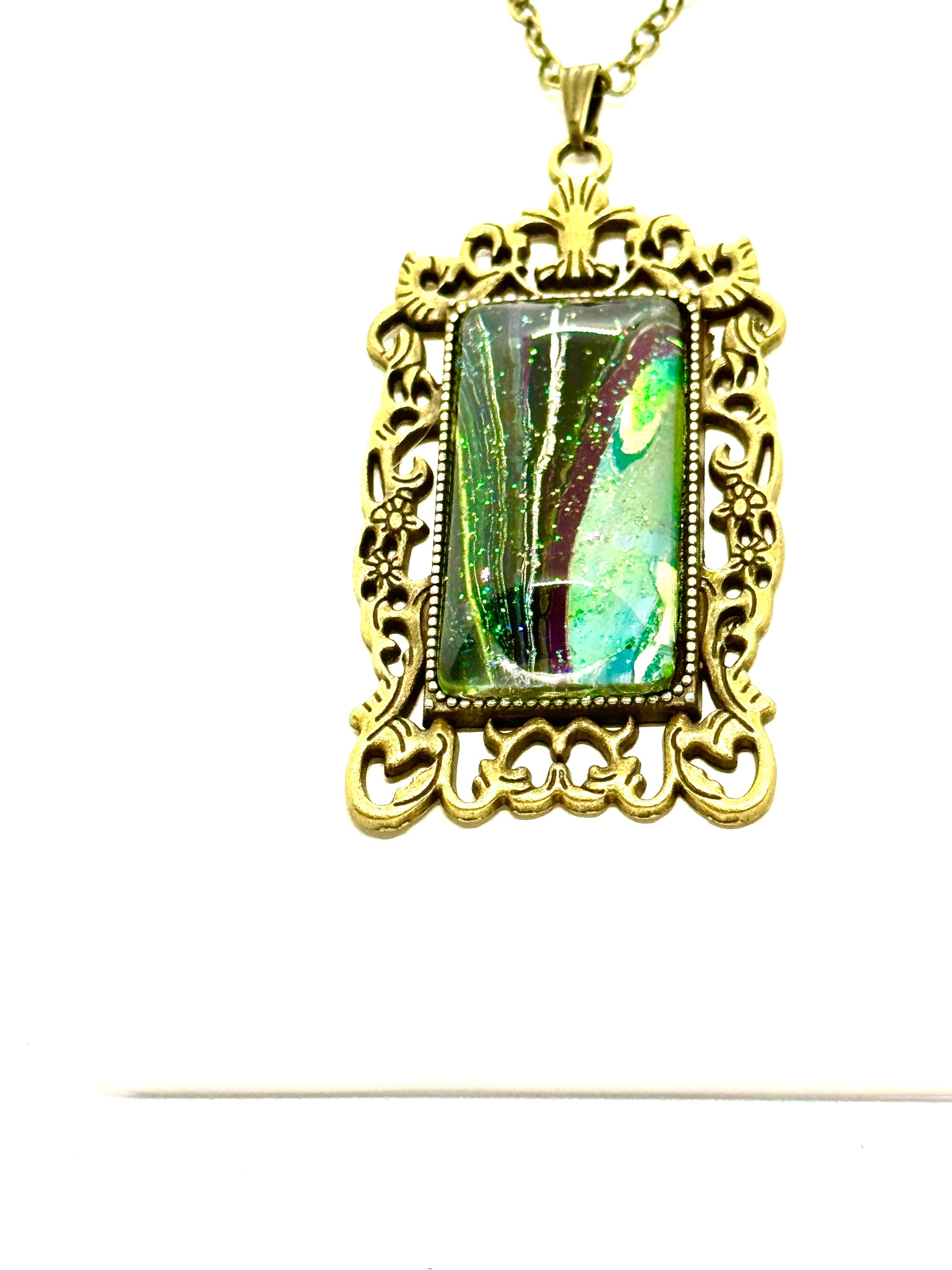 Elevate your style with our Large Paint Pour Pendant Necklace ! This unique necklace features a large rectangular pendant with stunning swirls of purple, blue, white, green, and black. Stand out and make a statement with this one-of-a-kind piece.
