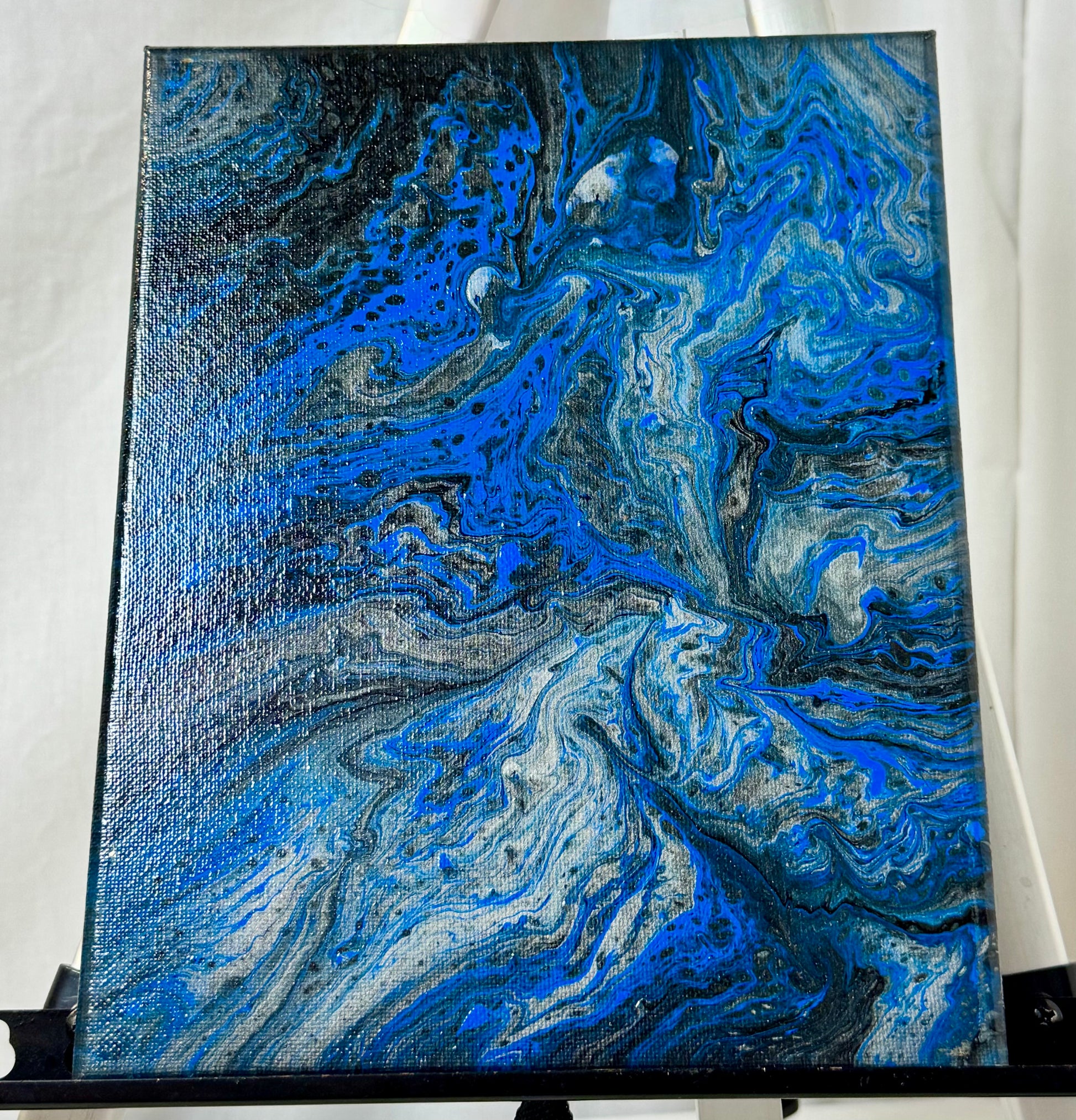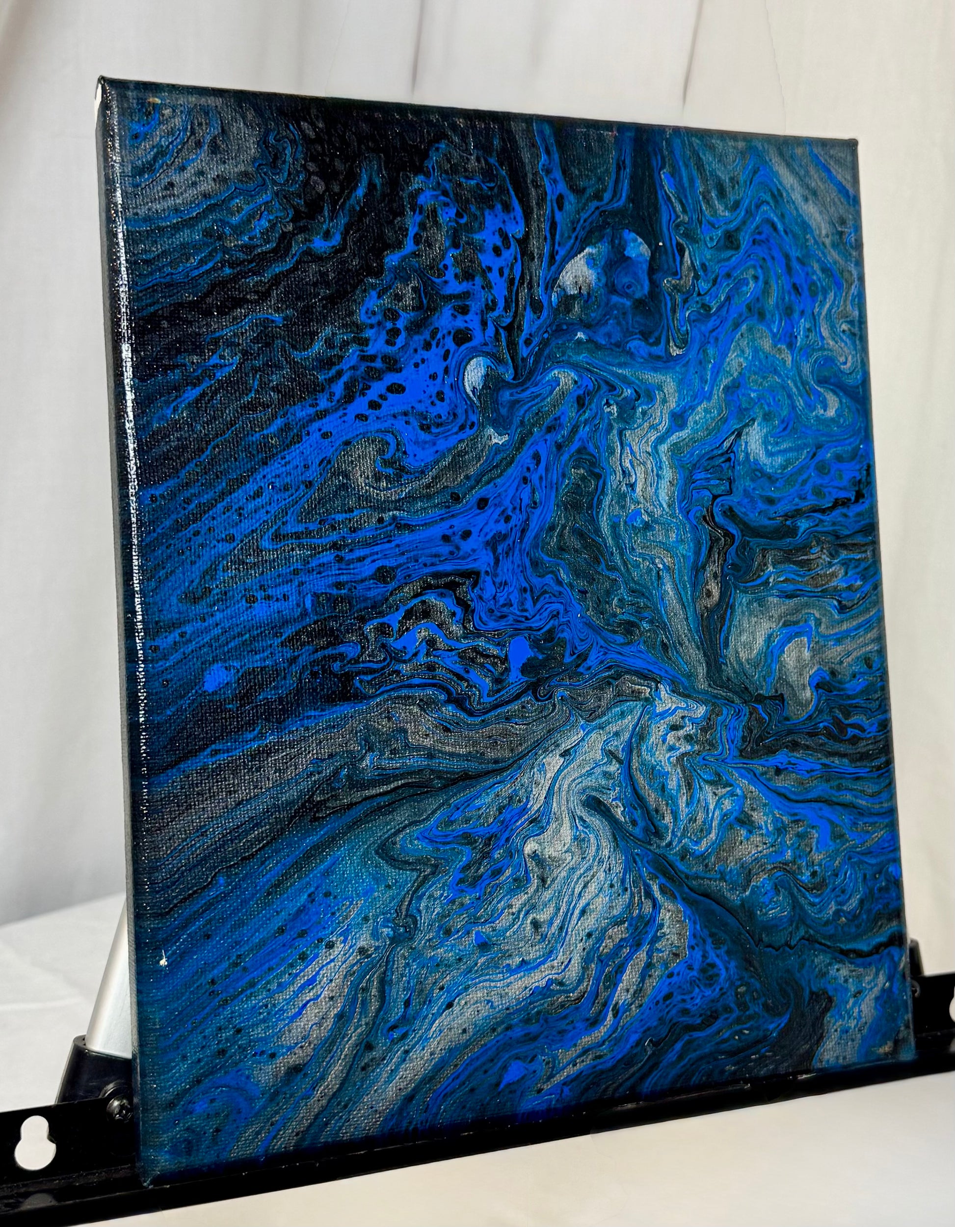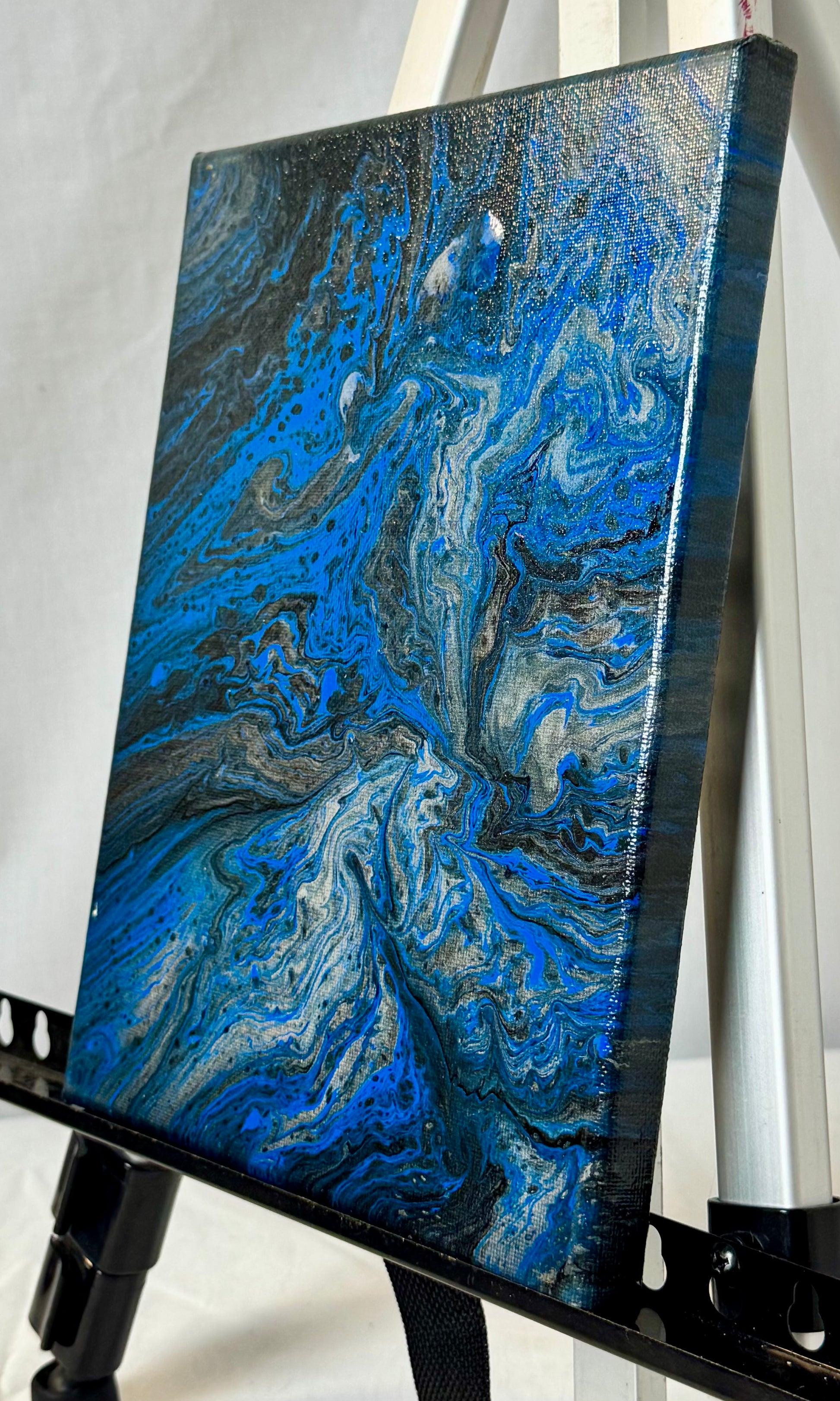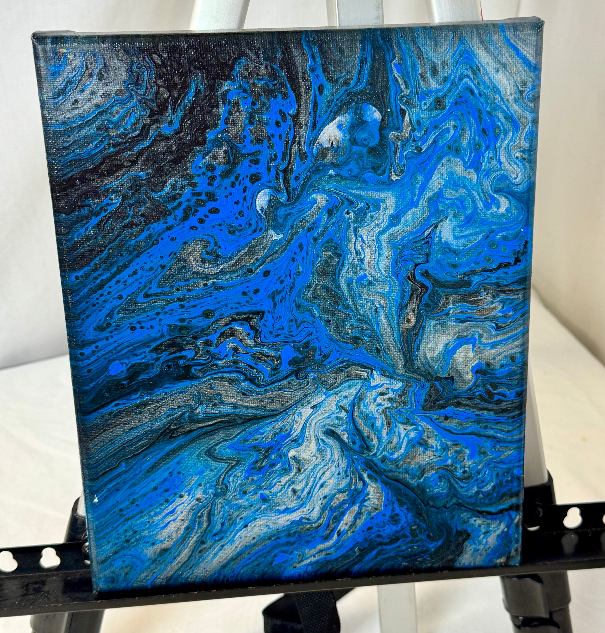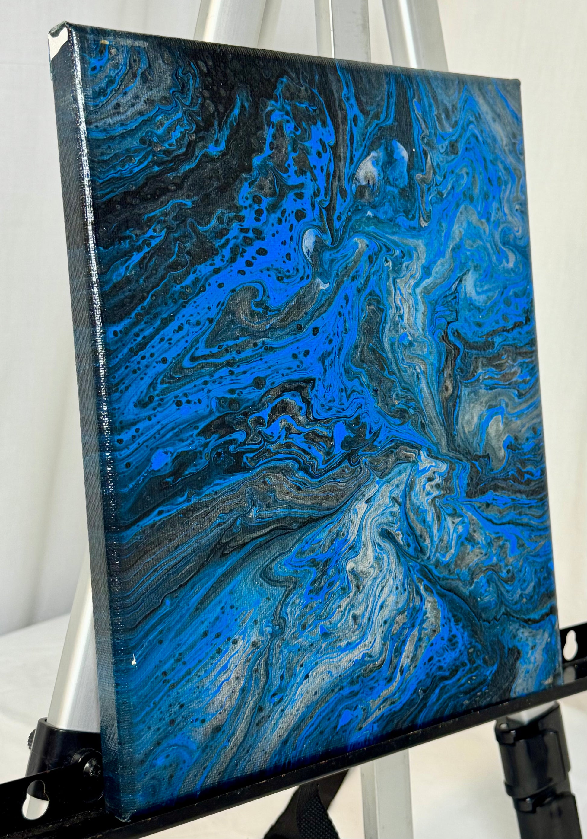 Discover the stunning beauty of our Midnight Spill canvas paint pour painting! The mix of blue, black, silver, and white creates a mesmerizing effect on this 8x10" canvas. Perfect for adding a touch of sophistication to any room, this piece will surely inspire strong emotions in any buyer.