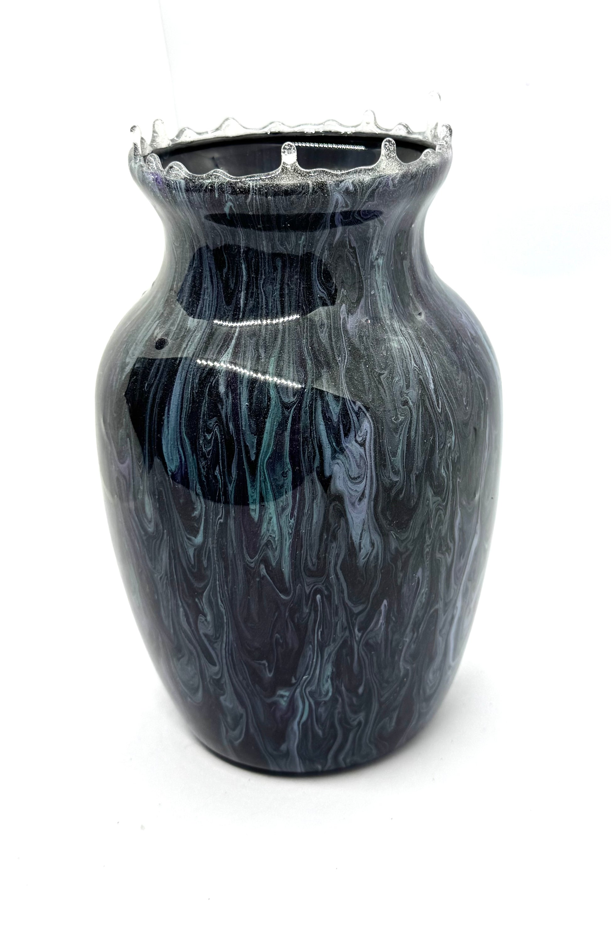 Hand-poured resin with smoky blacks, stormy grays, ghosted teal, and subtle violet streaks that move differently from every angle. Finished with a jagged drip rim that refuses to be symmetrical or polite. The interior is deep, glossy black — dramatic enough to swallow light and whatever expectations you had.