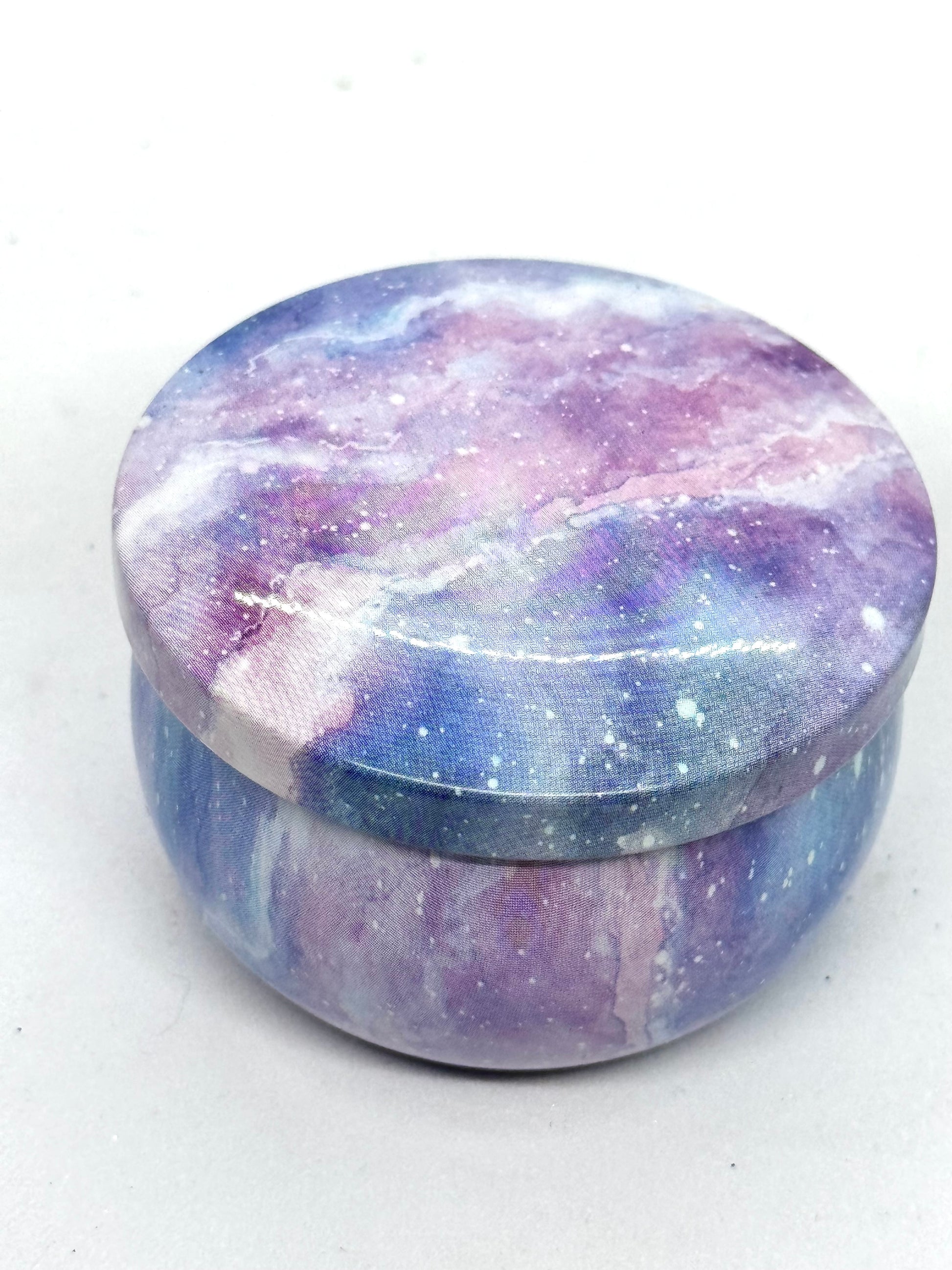 This handmade strawberry-scented candle brings juicy berry vibes wrapped in a trippy, galaxy-style container. It looks soft, smells sweet, and quietly judges your life choices while doing it.