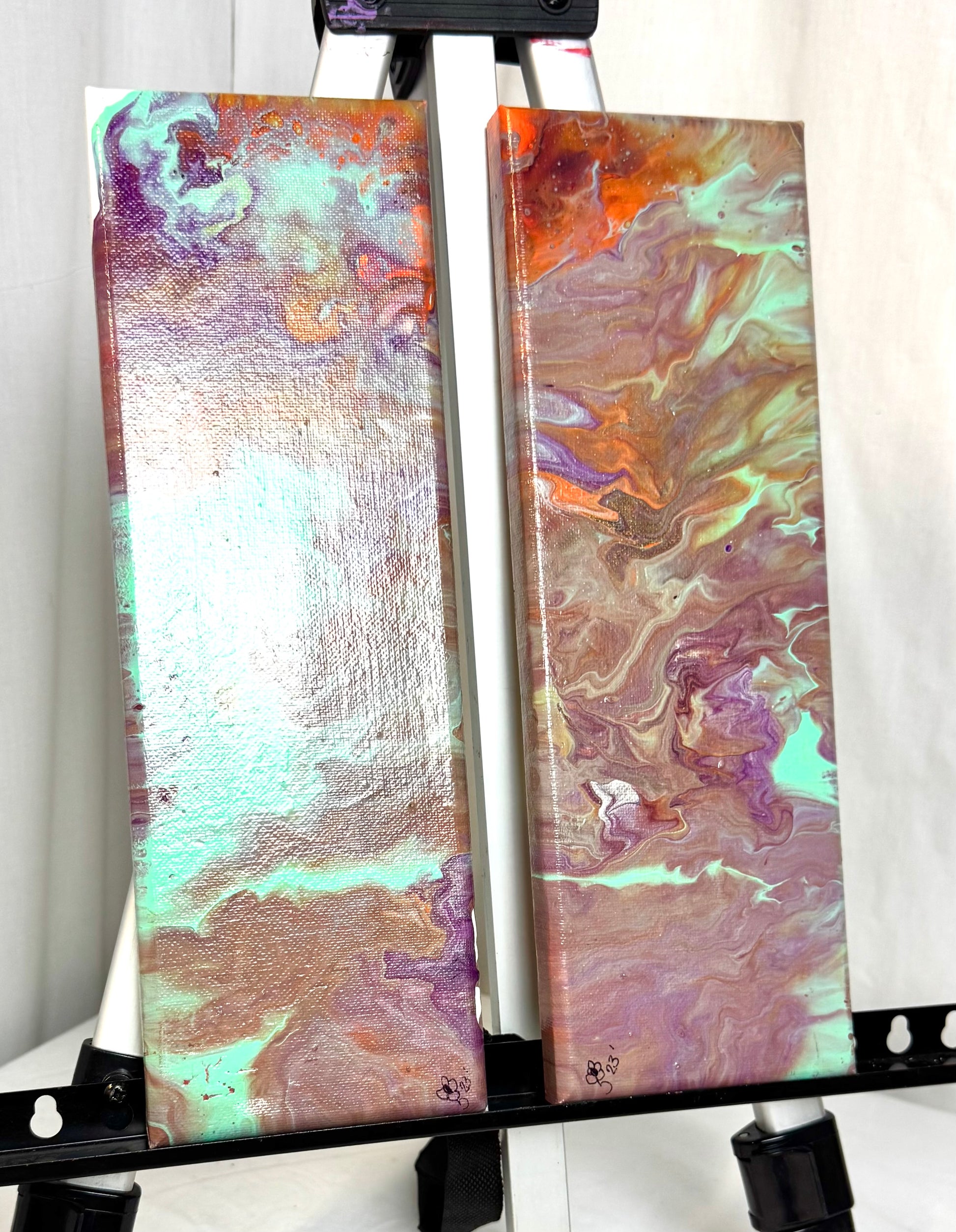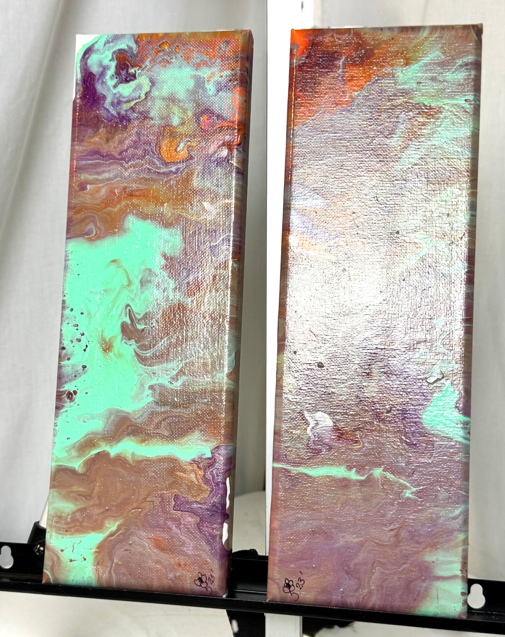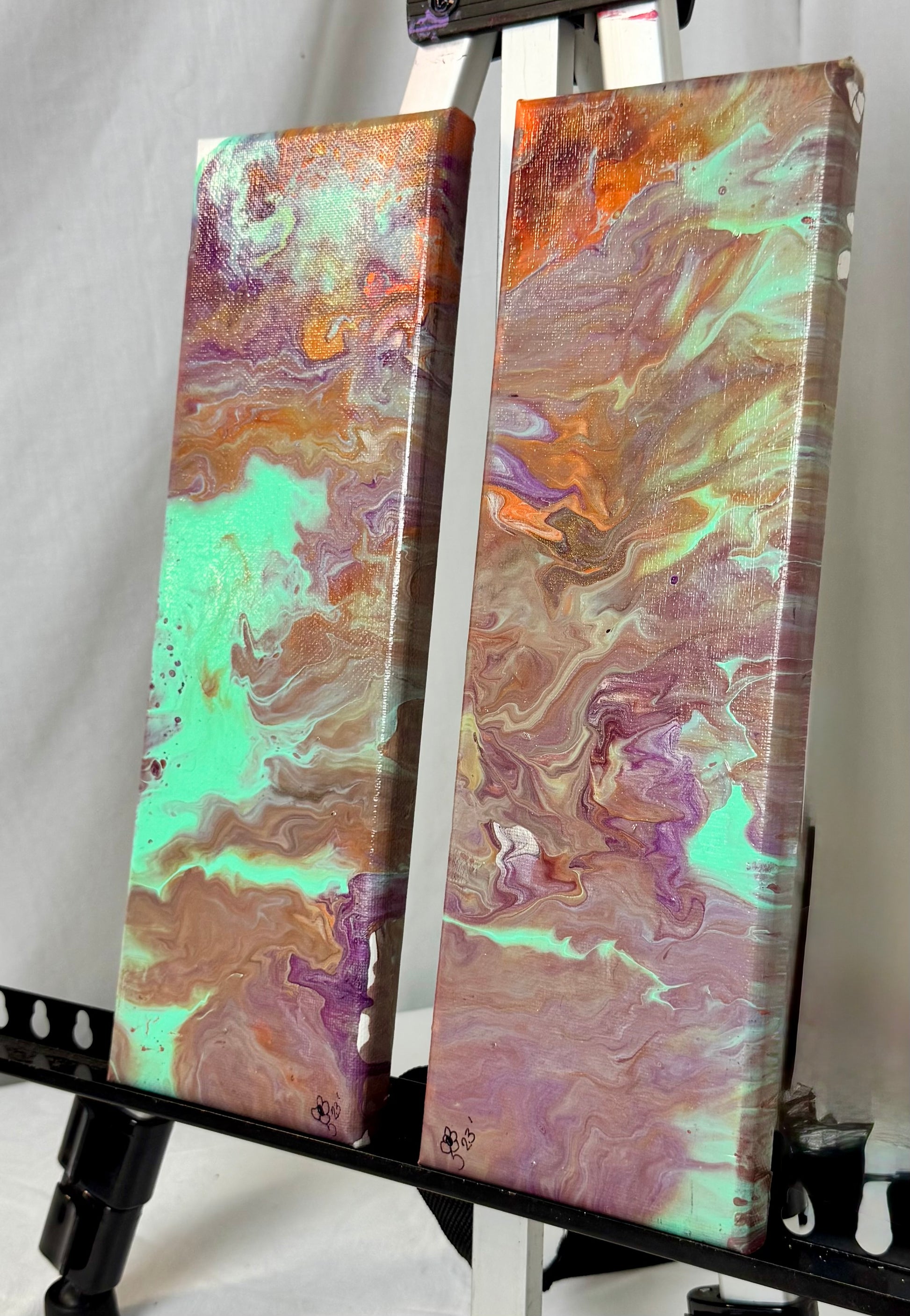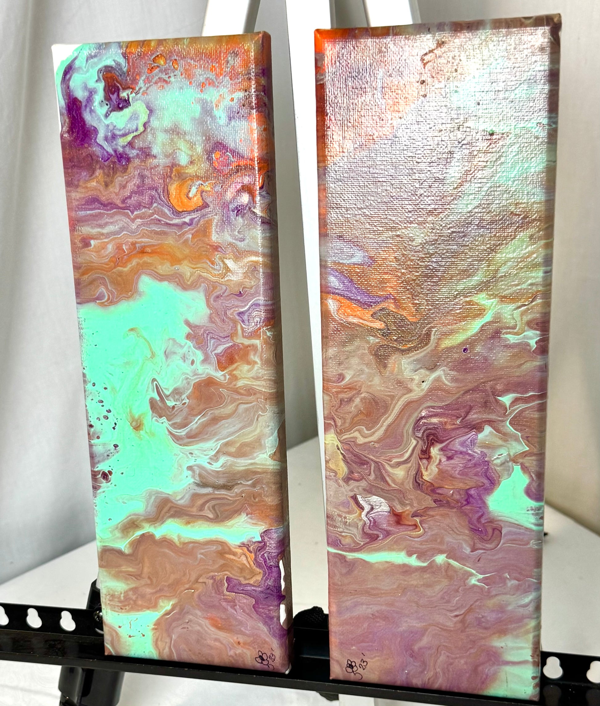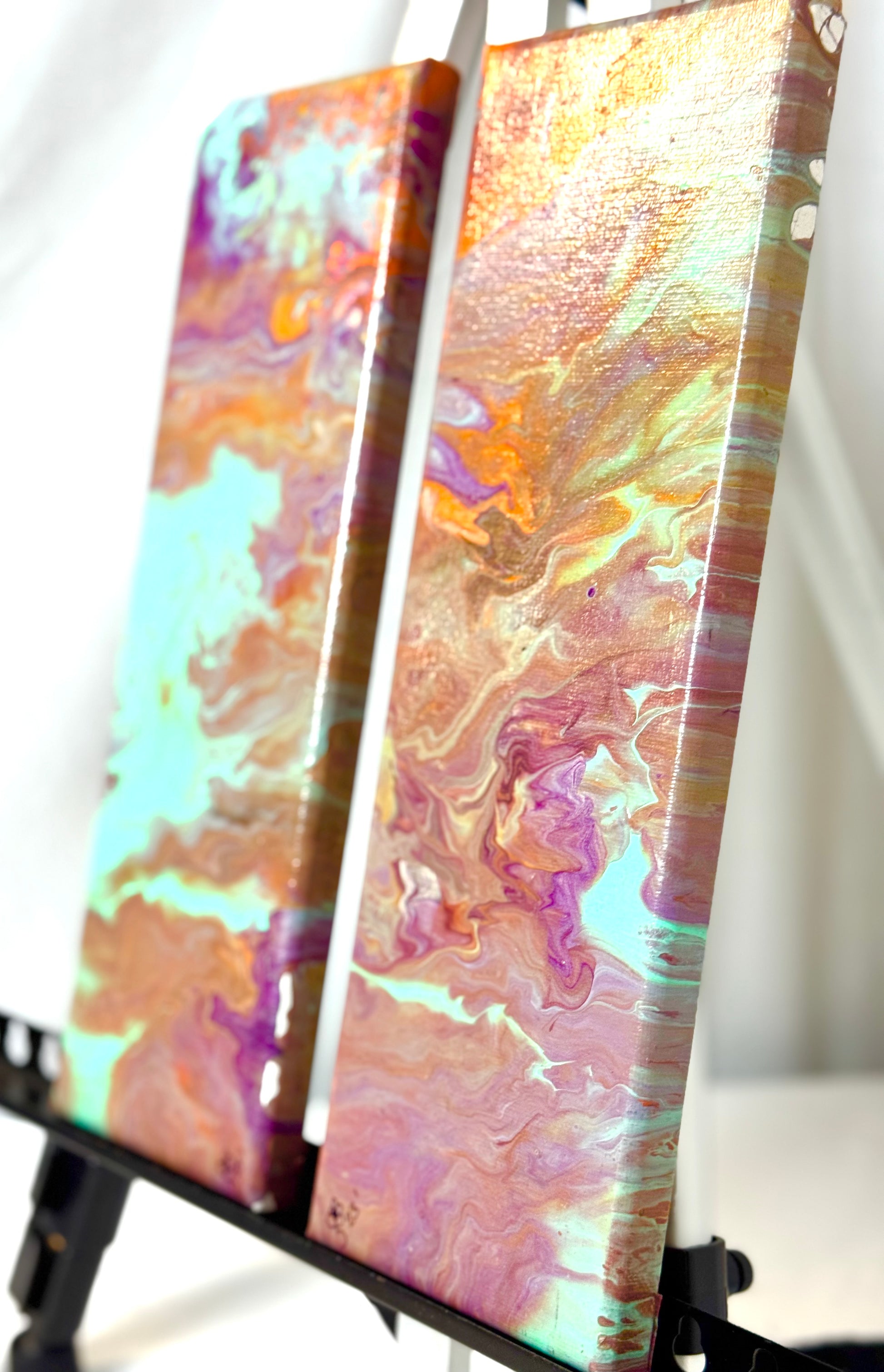 Experience the vibrant colors and textures of our Sunset Rider acrylic paint pour painting. With 2 panels measuring 4x12 inches each, this piece is perfect for any space. Add a touch of creativity and inspiration to your home decor with Sunset Rider.