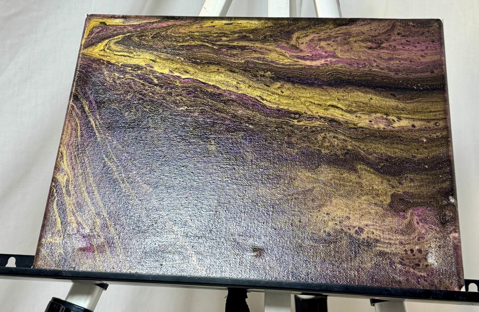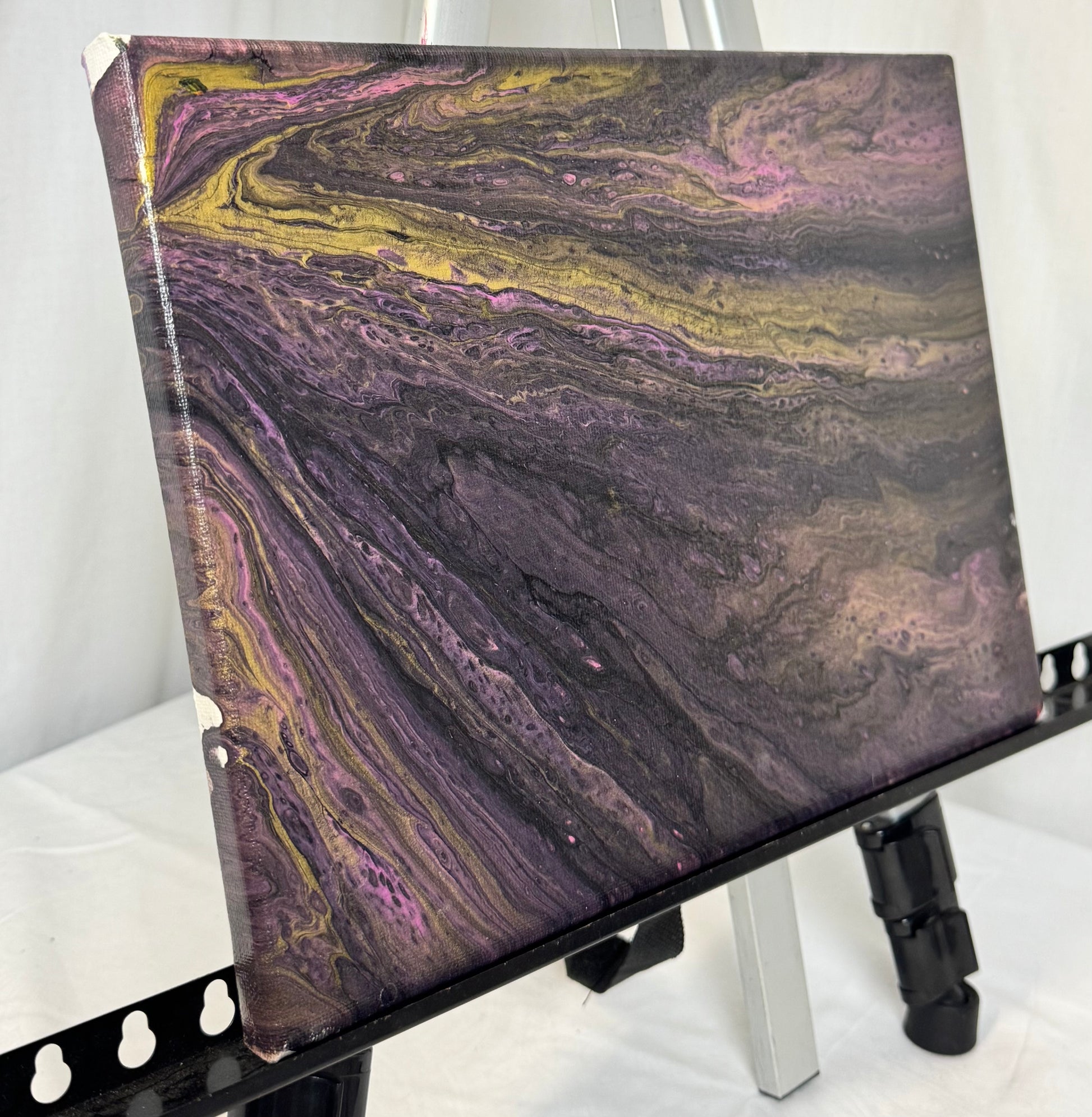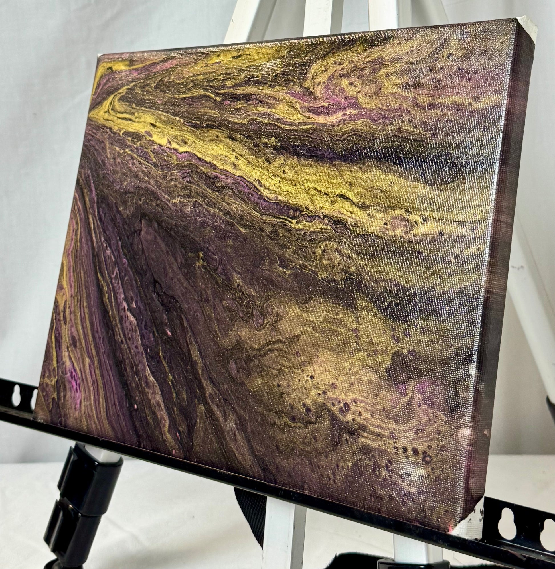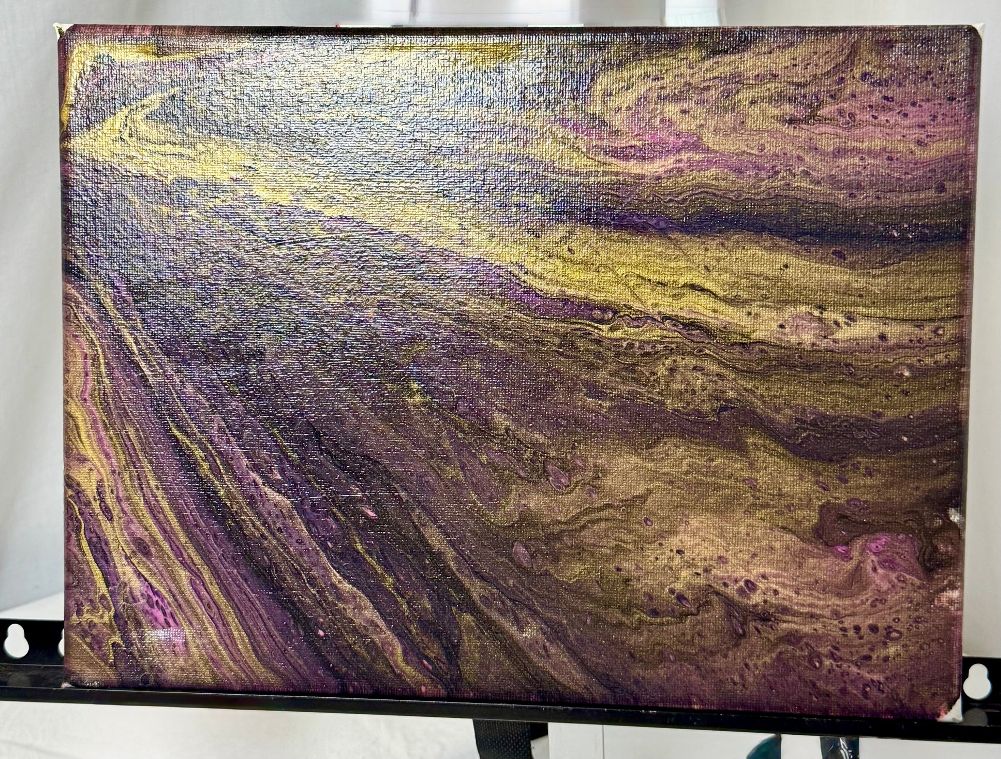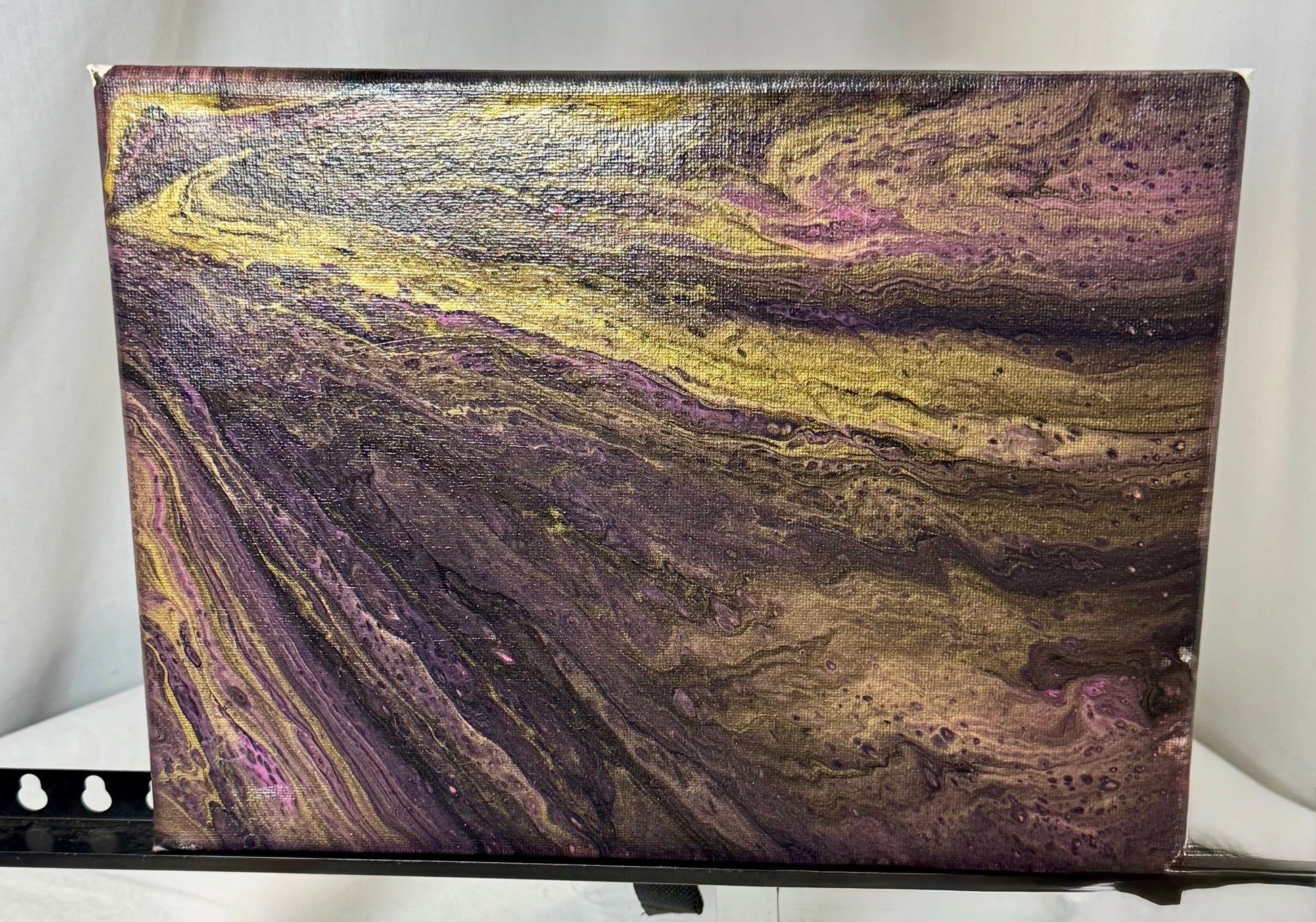 PExperience the beauty and magic of the Thread of Time painting. This 9x12" masterpiece features a stunning purple and gold paint pour design that will captivate your senses. Hang it in your home and be inspired by its unique blend of colors and textures. Bring the essence of time into your space with this one-of-a-kind piece.