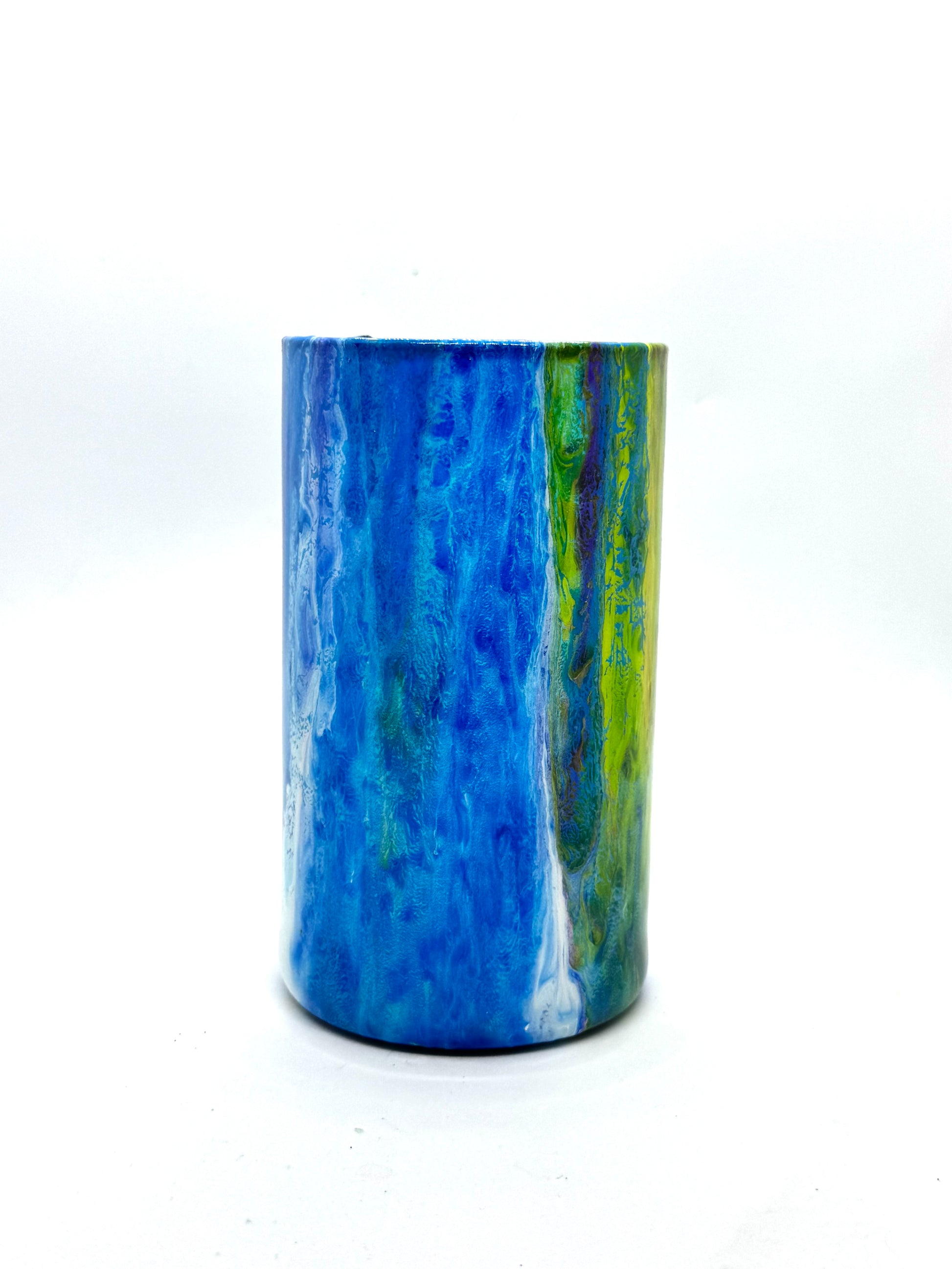 Layers of electric blue, deep teal, and flashes of acid green swirl together in a glossy, hand-poured finish that refuses to sit still. Every angle shifts, every side hits different, and no two are ever the same—because mass production is boring and this piece didn’t sign up for that.