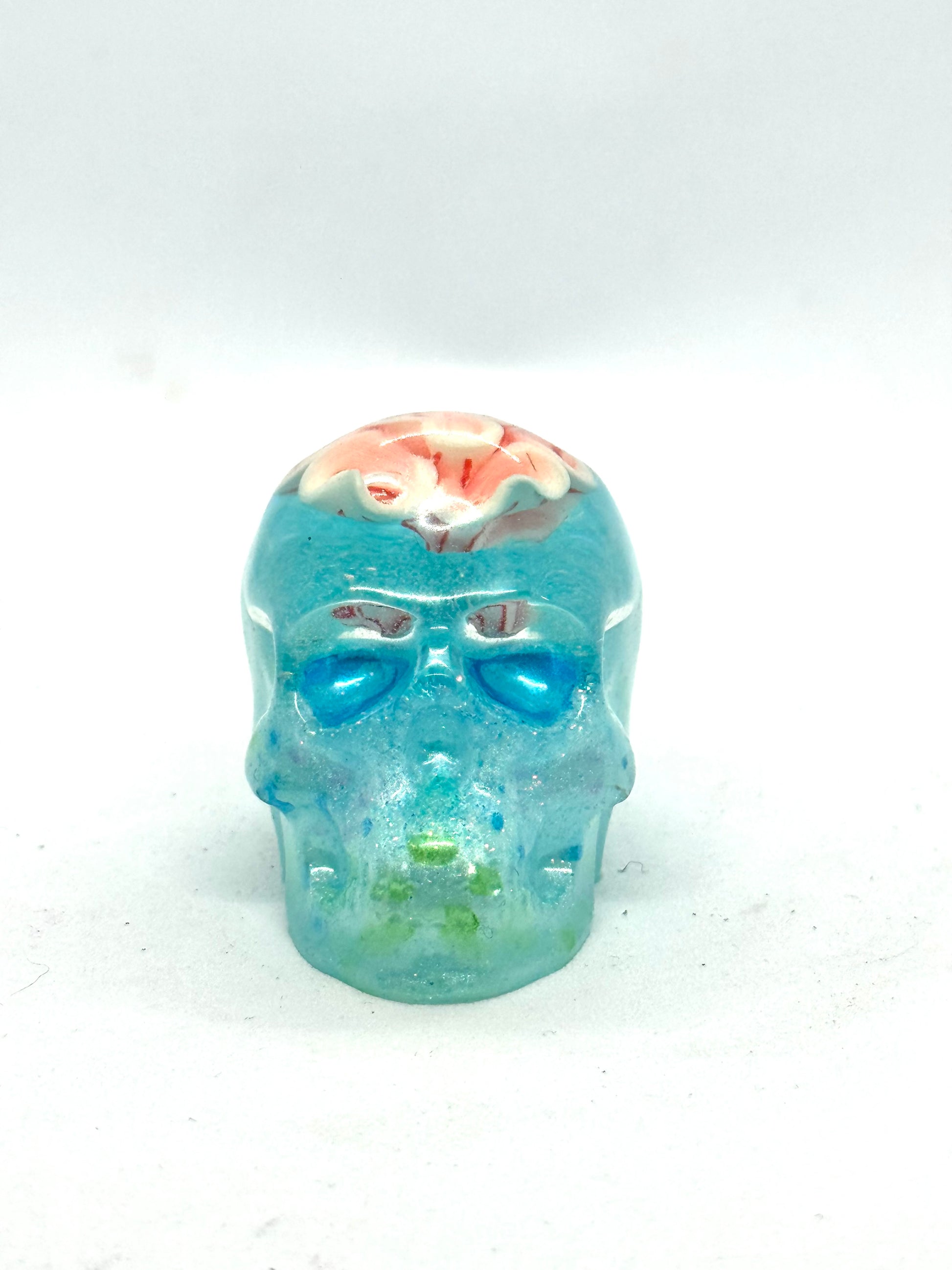 Hand-poured and one-of-a-kind, this resin skull features a translucent aqua base with embedded detail that looks like thoughts you probably shouldn’t have survived — yet here you are. Topped with an exposed “brain” detail because subtlety was never the plan.