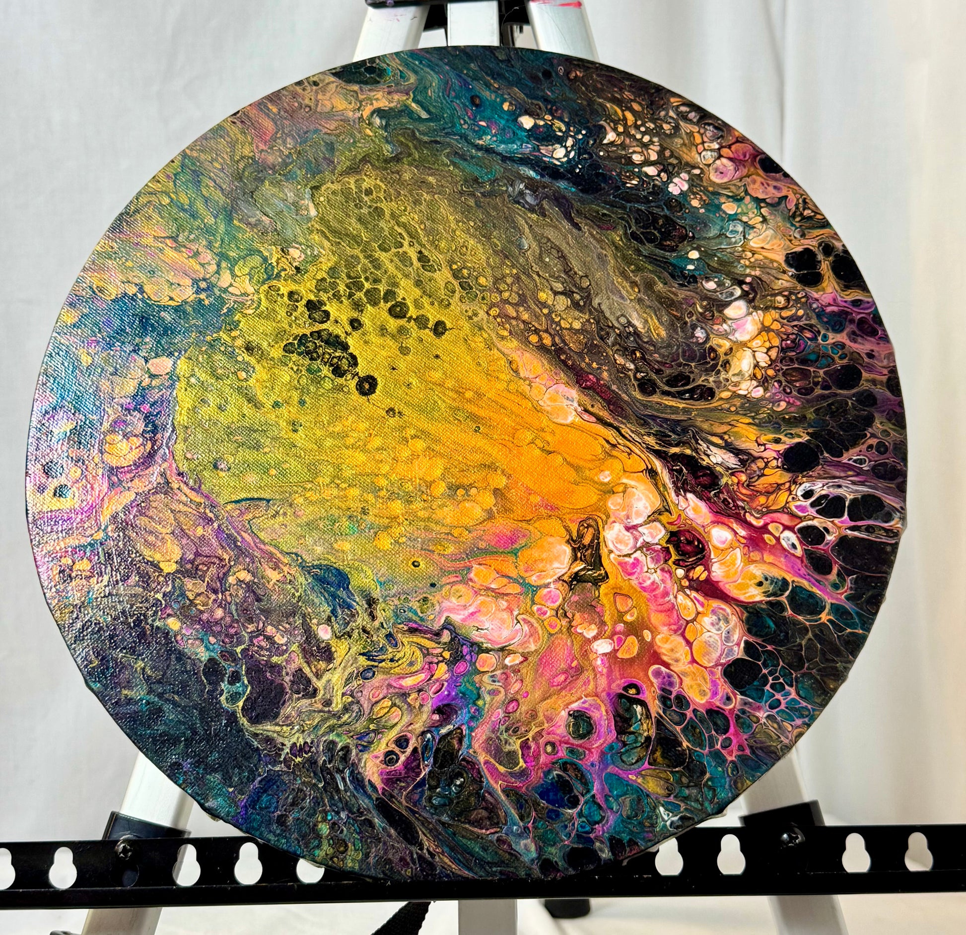 Experience the power and beauty of nature with our Volcanic Geode painting. This 12" round canvas is adorned with a mesmerizing paint pour style, showcasing a variety of vibrant acrylic paint colors. Bring the energy of a volcanic eruption into your home or office with this stunning piece.