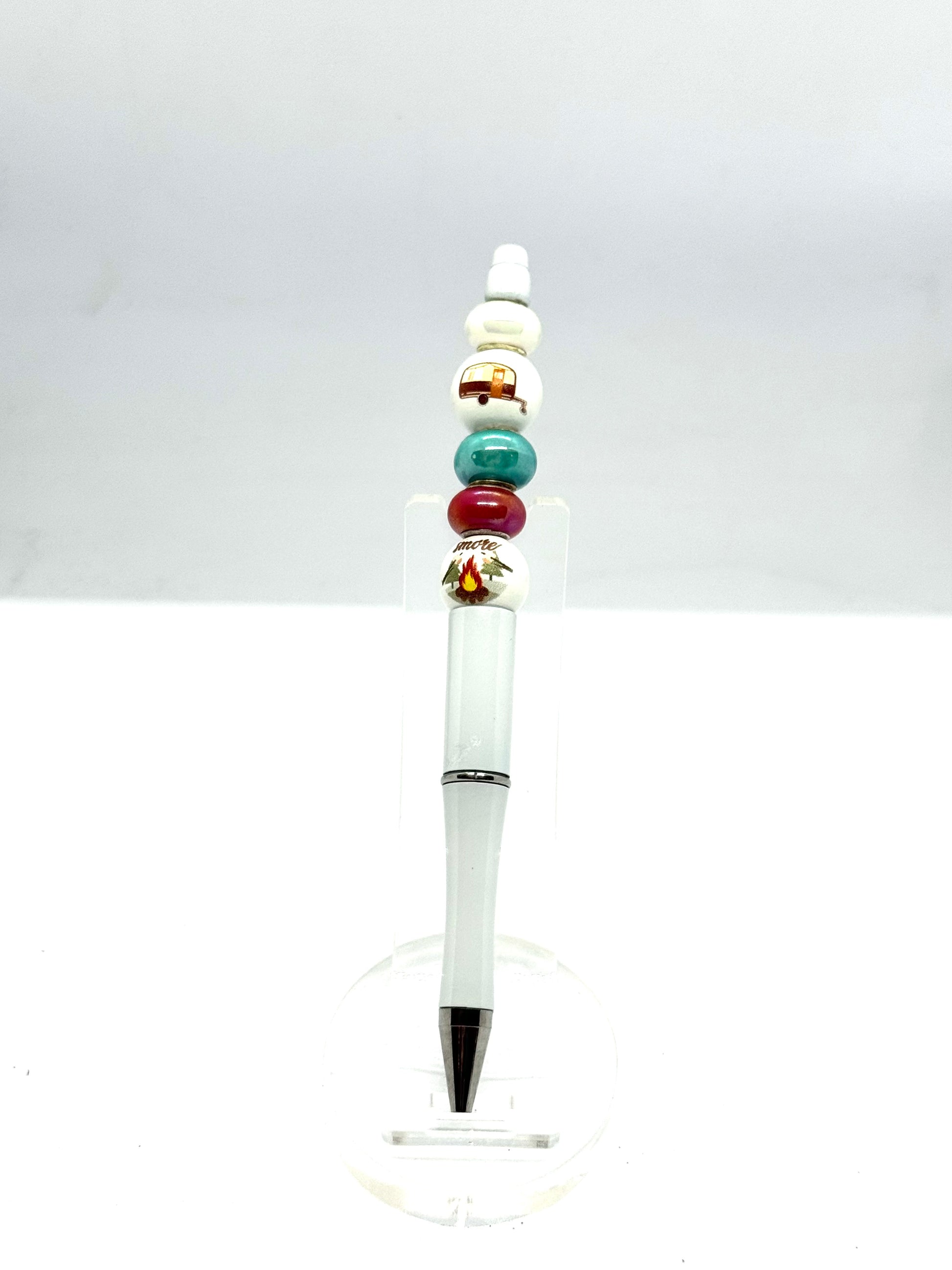 This White Camper Pen is more than just a writing tool, it's a piece of inspiration. The refillable white pen is adorned with charming wooden camper beads, making it a unique and stylish addition to any desk. Perfect for those with a passion for travel and adventure.